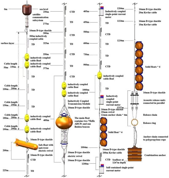 The core temperature and salinity data were provided by nineteen instruments: seven SBE37-SM MicroCAT CTD sensors (Sea-Bird Scientific, Bellevue, WA, USA) and twelve OceanPlot TD-IM inductive temperature-depth sensors (OceanPlot, Hangzhou, China). The SBE37-SM sensors were chosen for their proven high accuracy and long-term stability in measuring the fundamental parameters of conductivity, temperature, and pressure, from which salinity is derived. The TD-IM sensors provided complementary high-precision temperature and depth measurements, significantly increasing the spatial density of the thermal structure observation.