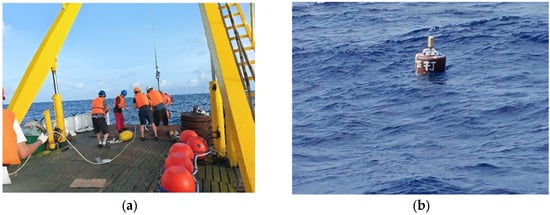 The mooring system was deployed on 22 June 2024. The deployment site was selected at a depth of 1247 m in the northern South China Sea, a region known for its strong internal solitary wave activities, providing an ideal environment for validating the system’s capability to capture dynamic processes. The deployment procedure followed the standard sequence: first, the surface communication buoy was lowered, followed by the controlled deployment of the mooring line with sensors, the main float, release and finally, the anchor weight. The field operation diagram for deploying the moored buoy is shown in Figure 4.