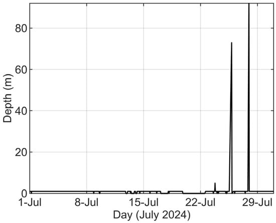 The system commenced data transmission immediately after deployment. Over the initial 42-day observation period, the shore station achieved a data reception rate of 90.45%. As shown in Figure 5, the depth data from the communication buoy in July is analyzed. The buoy remained above sea level most of the time, but occasionally dipped into the water, which compromised its communication effectiveness. Analysis of buoy communication data reveals a significant correlation between the frequency of communication interruptions and the astronomical spring tide cycle, with failures primarily occurring around the periods of new moon and full moon spring tides. The fundamental cause of this phenomenon likely lies in the active internal solitary waves in the South China Sea. During the passage of internal solitary waves, extremely strong sudden currents are generated at the sea surface, which will pull the buoy into the sea. In the future, we will optimize the anchor system design and consider adopting longer mooring line or bigger buoyancy to enhance its stability under strong current impacts. Simultaneously, we will strengthen communication system redundancy to enable automatic data re-transmission upon recovery, fundamentally improving system reliability and data acquisition rates.