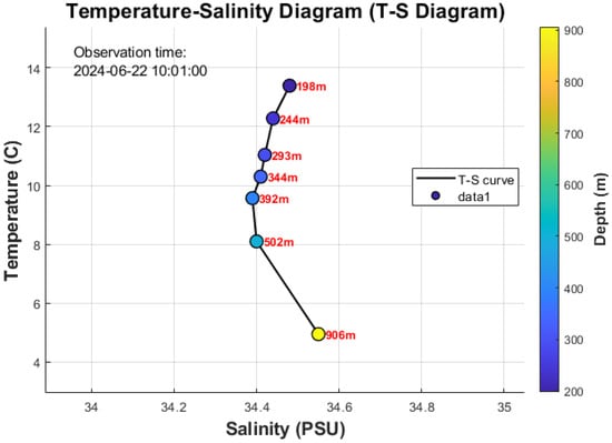 The T-S diagram (Figure 8) provides a integrated view of the water mass structure in the northern South China Sea. The data points, colored by depth, form a tight, coherent curve that aligns well with the known T-S characteristics of this region [26]. The temperature and salinity distribution ranges of this water mass are 4.95–13.39 °C and 34.39–34.55‰, respectively. This water mass is the least altered oceanic-type water mass in the South China Sea region, retaining the fundamental characteristics of mid-depth water masses in the western Pacific. The stability and clarity of this T-S relationship, derived from our multi-sensor array, validates the high quality and internal consistency of the data delivered by the inductive telemetry system.