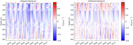 Profile Measurements: Two 75 kHz Teledyne Workhorse Long Ranger ADCPs (Teledyne RD Instruments, Poway, CA, USA) were mounted on the main subsurface buoy at approximately 400 m depth. This configuration was designed to maximize the coverage of the water column: one ADCP was oriented upwards to profile currents from the buoy towards the surface, and the other was oriented downwards to measure currents from the buoy towards the seabed. This setup provides a comprehensive view of the current shear and structure over most of the water column, which is essential for understanding dynamics like eddies and deep currents.