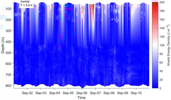 Figure 9 presents high-resolution ocean current profile data acquired during the passage of Typhoon Yagi in 1–10 September 2024, analyzing the dynamic response of the upper ocean to the intense typhoon. Observations reveal a strong surface current pulse of up to 0.6 m/s in the northward component during the typhoon’s core passage, rapidly decaying with depth. Figure 10 shows the distribution of near-inertial energy during the typhoon. It can be observed that energy is primarily confined within the upper 200 m, exhibiting distinct near-inertial oscillatory characteristics. The signal period is approximately 5.6 h, nearly identical to the local inertial period, indicating that near-inertial motion dominates the flow field. This exhibits typical wind-driven flow structure and near-inertial oscillation characteristics. Concurrently, the eastward component velocity shows frequent directional shifts correlated with the typhoon’s rotating wind field. The overall flow field was dominated by a northward component, indicating the observation point was located on the typhoon’s right-side path—the region receiving the strongest energy input. This study visually reveals how Typhoon Yagi injected immense energy into the upper ocean and drove intense currents, providing a key case study for understanding typhoon-ocean interactions.