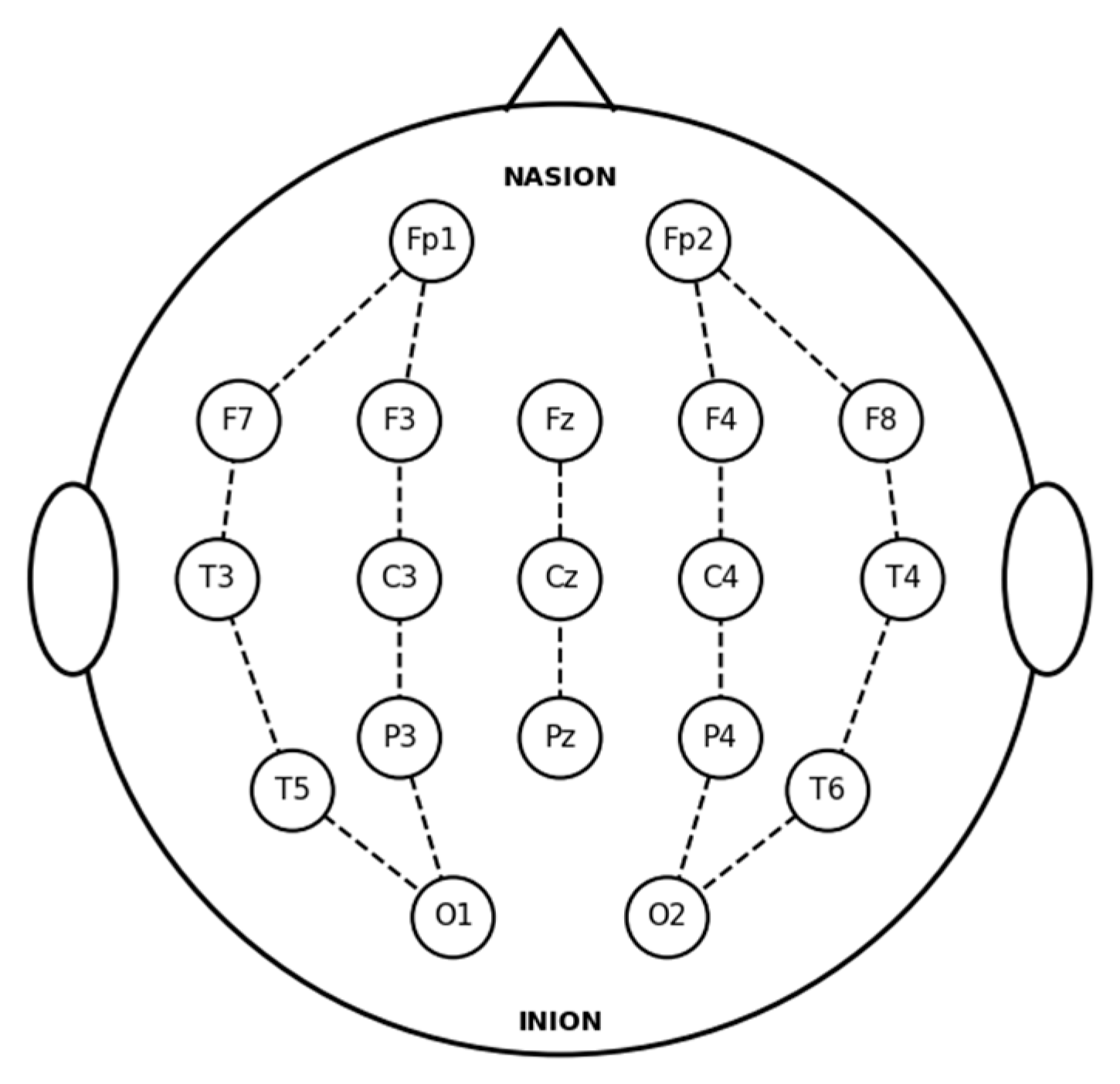 Figure 1 illustrates the standard 10–20 electrode layout utilized for the EEG recordings. The 18 bipolar channels derived from these electrodes are defined as follows: Fp2-F4, F4-C4, C4-P4, P4-O2, Fp1-F3, F3-C3, C3-P3, P3-O1, Fp2-F8, F8-T4, T4-T6, T6-O2, Fp1-F7, F7-T3, T3-T5, T5-O1, Fz-Cz, and Cz-Pz.