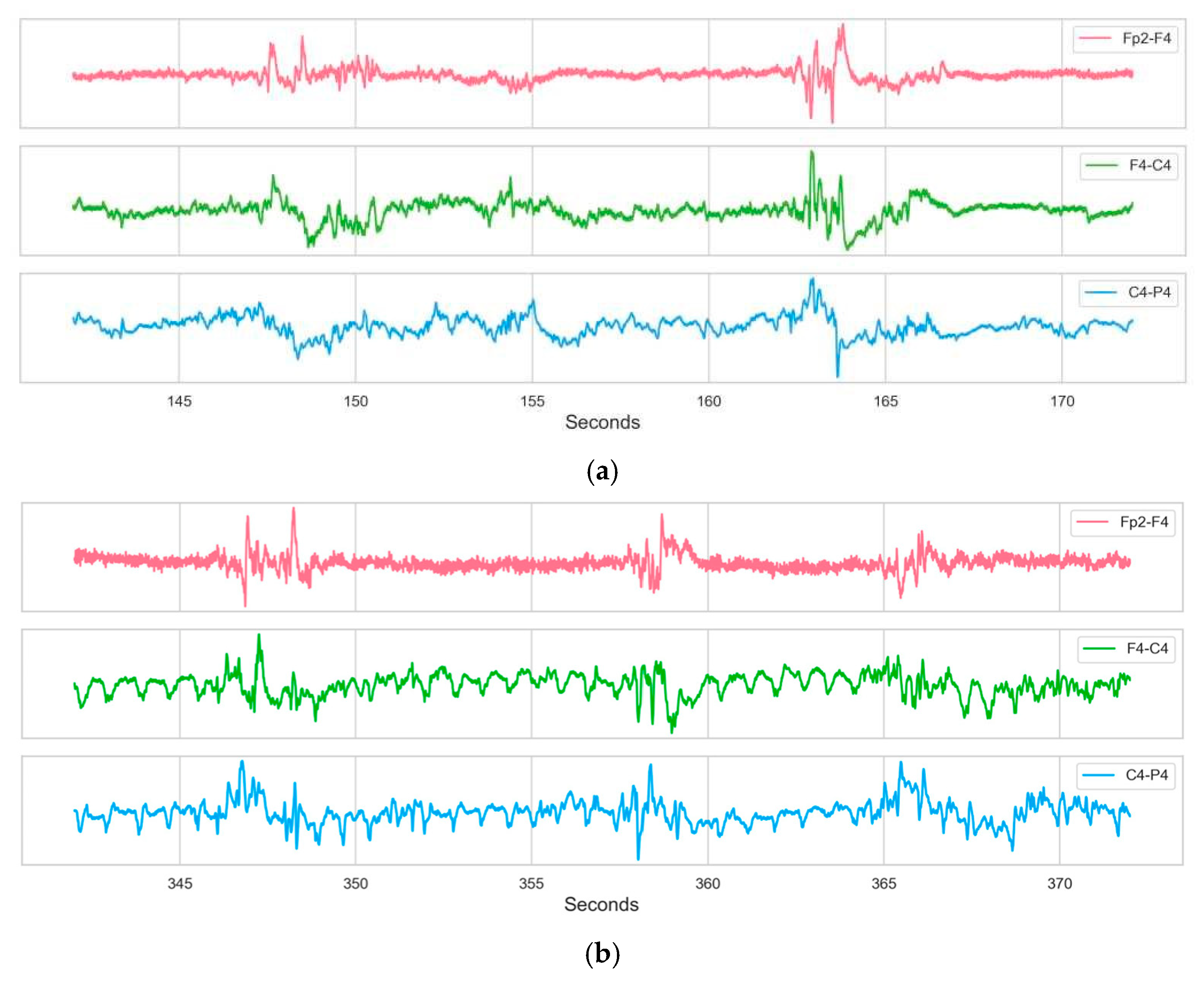 12]. This dataset comprises multi-channel electroencephalograms from 79 term neonates admitted to the NICU at Helsinki University Hospital. The study involving this dataset has received the necessary ethical approvals. The EEG signals were acquired using the NicoletOne vEEG System (Natus Medical, Middleton, WI, USA) at a sampling frequency of 256 Hz, with a recording duration of approximately 60 min per subject. Specifically, the duration of each window was set to 2 s. Although the raw EEG signals were sampled at 256 Hz, we downsampled them to 128 Hz during preprocessing to reduce computational complexity and filter out high-frequency artifacts. Consequently, each 2-s window corresponds to 256 sampling points in the time domain.