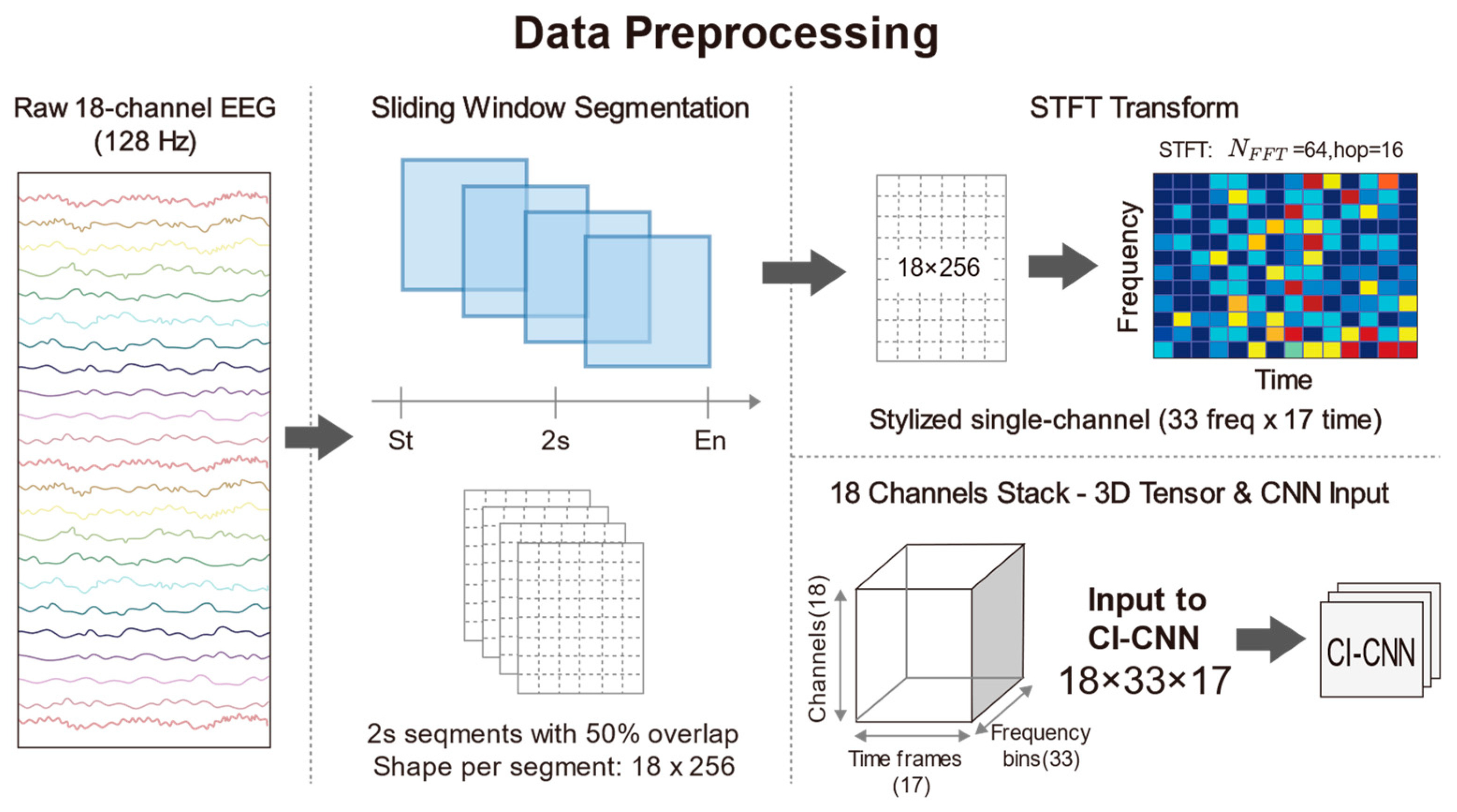 ) was set to 64, and the sliding hop length was set to 16. No manual zero-padding was applied; boundaries were handled via standard centering. Given the sampling rate of 128 Hz, this configuration yields a frequency resolution of 2 Hz. This choice explicitly favors temporal resolution over fine-grained spectral detail, enabling the effective capture of transient high-frequency spikes while maintaining sufficient resolution for low-frequency (0.5–30 Hz) pathological slow waves. Following the STFT transformation, the complex spectrum was obtained, and the natural logarithm of its magnitude was computed to compress the immense dynamic range of EEG signals and ameliorate data distribution skewness. Consequently, each EEG window was transformed into a 3D tensor with dimensions of 18 × 33 × 17, where 18 represents the number of spatial electrode channels, 33 denotes the frequency components, and 17 indicates the time steps. This time-frequency representation not only filters out a portion of background noise but also accentuates the regions of energy concentration associated with seizure onset. To accelerate neural network convergence and eliminate amplitude discrepancies between patients, Z-score normalization was further applied to the generated spectrograms, standardizing them to a mean of 0 and a standard deviation of 1. Through the aforementioned processing pipeline, raw physiological signals were converted into feature maps encapsulating three-dimensional information—space, frequency, and time—providing high-quality input data for the subsequent deep feature extraction based on ResNet. The detailed data preprocessing procedure is illustrated in