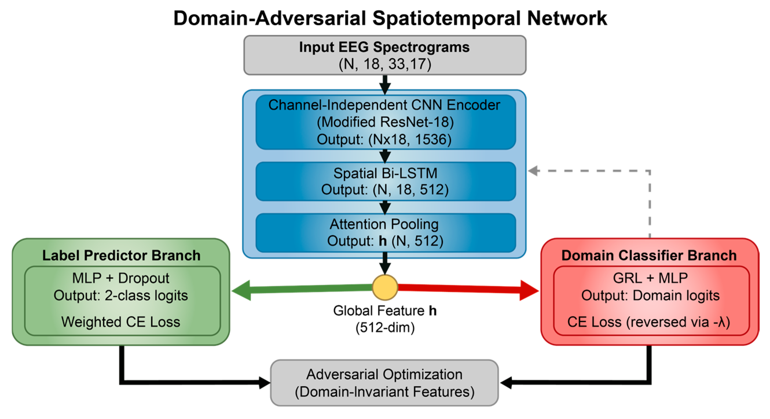 The DA-STNet constructed in this study is a deep neural network explicitly designed for cross-subject neonatal seizure detection. The network adopts a “shared backbone-dual branch” topology, aiming to concurrently process the recognition of seizure pathology and the obfuscation of subject identity. The model first utilizes a cascaded spatiotemporal feature extractor to map multi-channel EEG signals into a high-dimensional feature space. Subsequently, it introduces an adversarial mechanism via a GRL, establishing a competitive interplay between the main branch for label prediction and the adversarial branch for domain classification. This design effectively strips away individual identity information from the features while maintaining efficient feature extraction capabilities, thereby realizing a calibration-free, “plug-and-play” diagnostic solution.