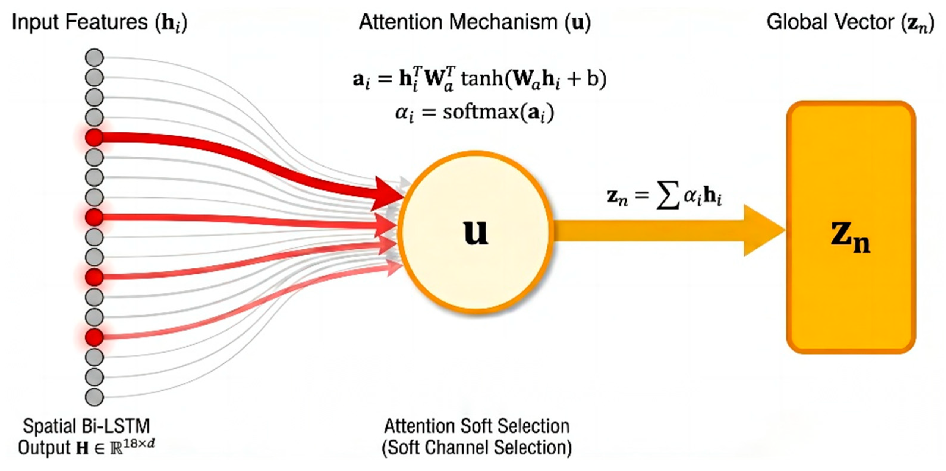 Attention Pooling: For the feature of each channel output by the Bi-LSTM, the attention module calculates a scalar score via a fully connected layer and normalizes it into a weight using a Softmax function. The model then aggregates information from all channels through weighted summation to generate a unique global feature vector. This 512-dimensional vector represents a high-level condensation of the entire EEG sample, providing the purest input for subsequent classification decisions.