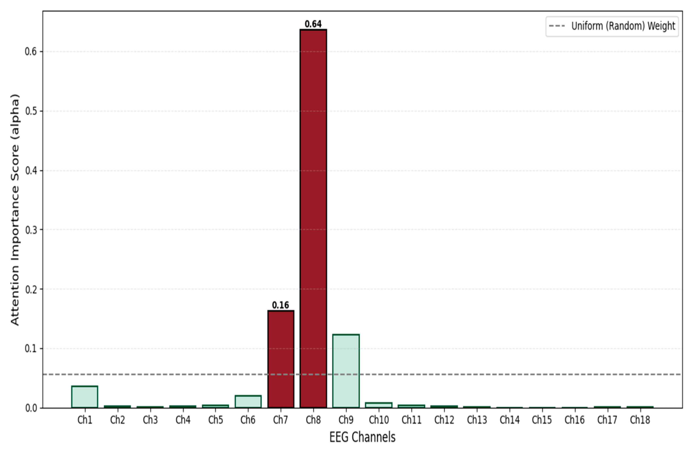 -th channel to the final diagnosis. This mechanism realizes a “soft channel selection” strategy: the model is capable of adaptively assigning higher weights to channels containing pathological characteristics, such as spike-and-wave discharges [