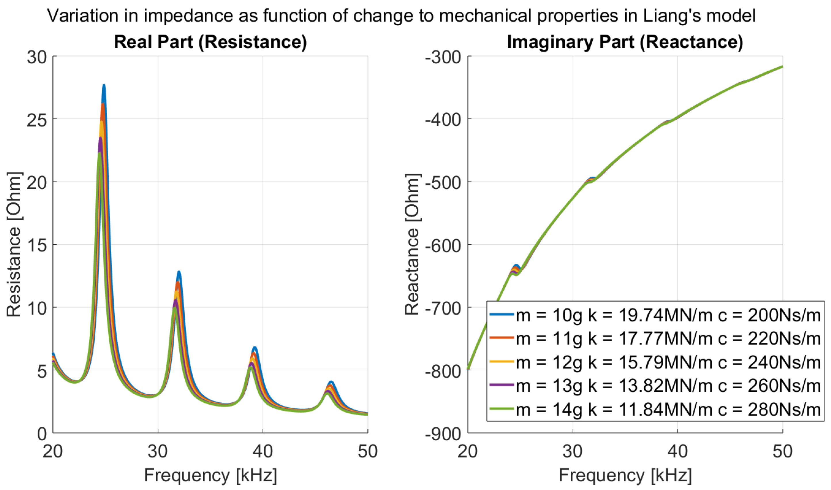 Effects of mechanical properties and electrical permittivity on impedance () in Liang’s model.
