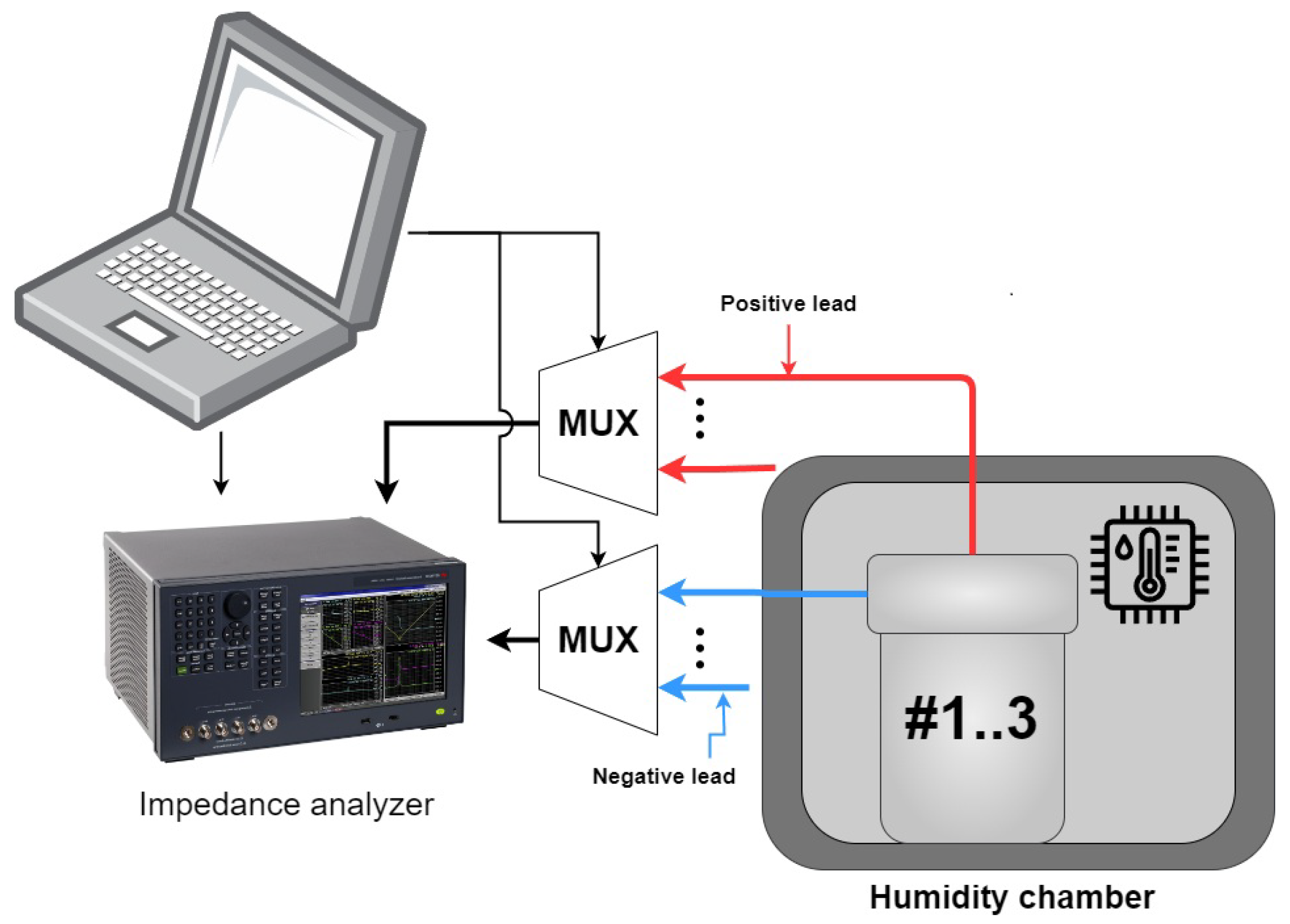 Samples #1 through #3 were placed in the humidity chamber with, two multiplexers being used to switch between the samples the impedance analyzer was connected to.