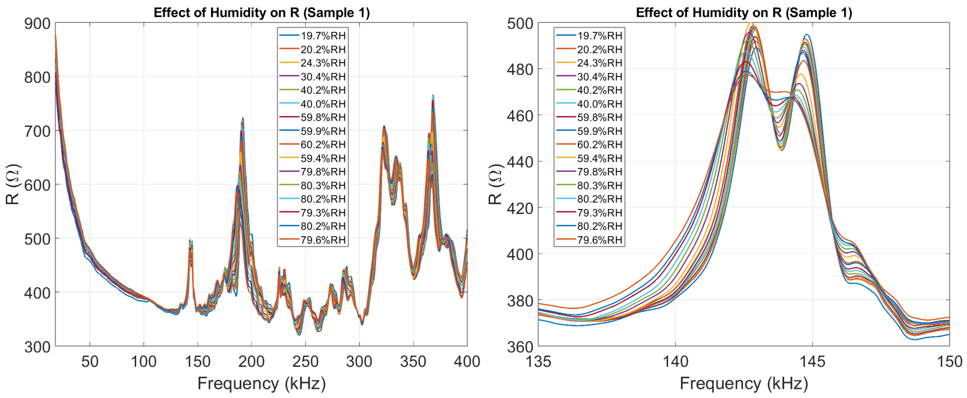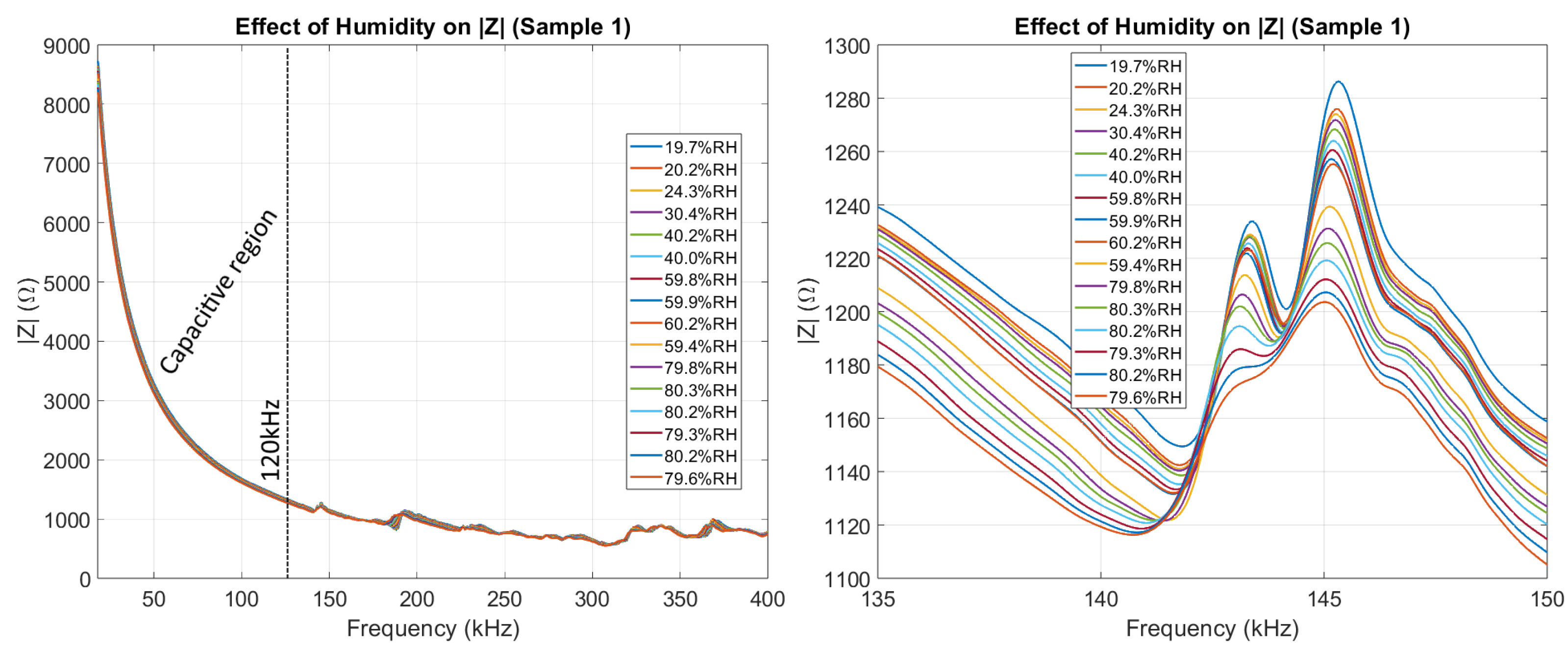 10] further observed that shifts in resonant peaks of the real part of the impedance vary across sensors, even under identical humidity levels, showing the short comings of using the frequency and amplitude shifts of the real part to extract humidity information.