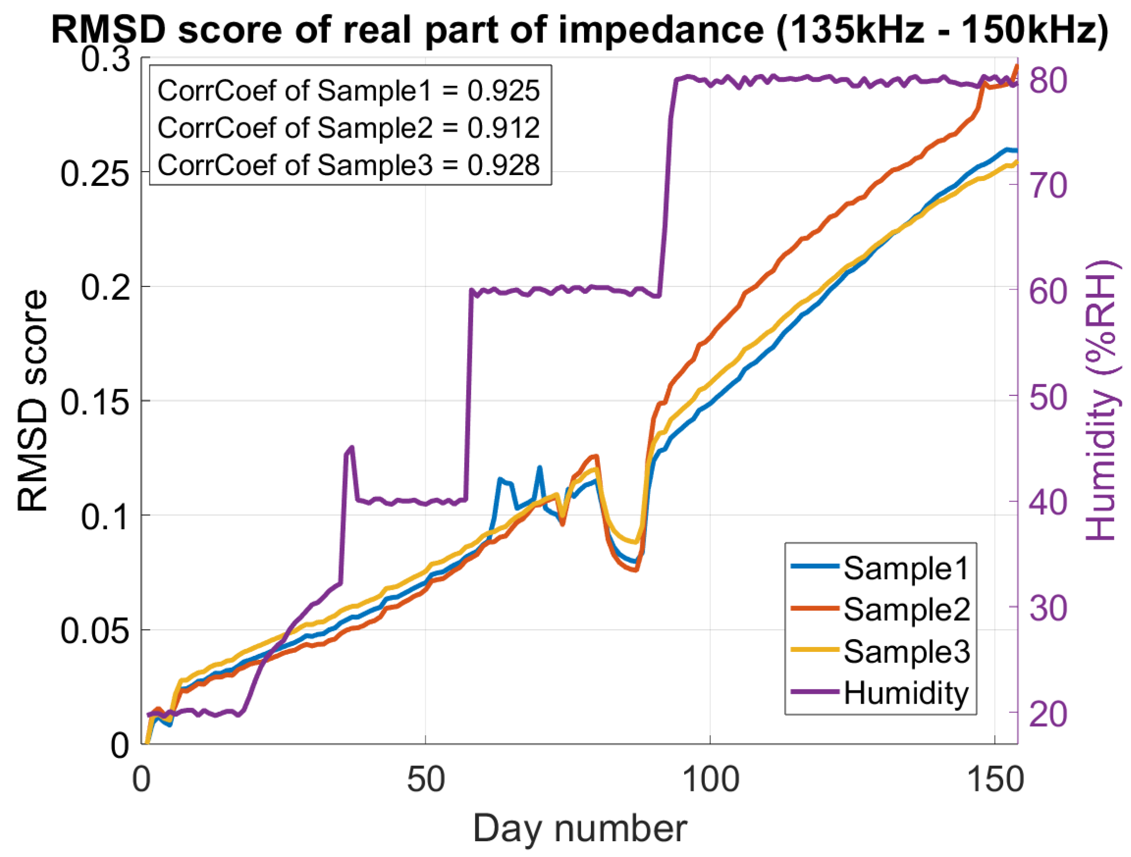 To ensure the reliable performance of the machine learning model, we make a key assumption: the absorption of water vapor into the concrete is linear over the duration of the experiment. Consequently, instead of using the air humidity reported by the environmental chamber as the target, we assume that the internal humidity of the concrete increases linearly from 20% to 80% over the duration of the test. On day #60, a physical connection on Sample 1 became loose, on day #79, the samples were taken out of the chamber and the problem was corrected. Moving the samples caused a dip in the RMSD score. For this reason, data collected between day#60 and day#90 were excluded from the analysis.