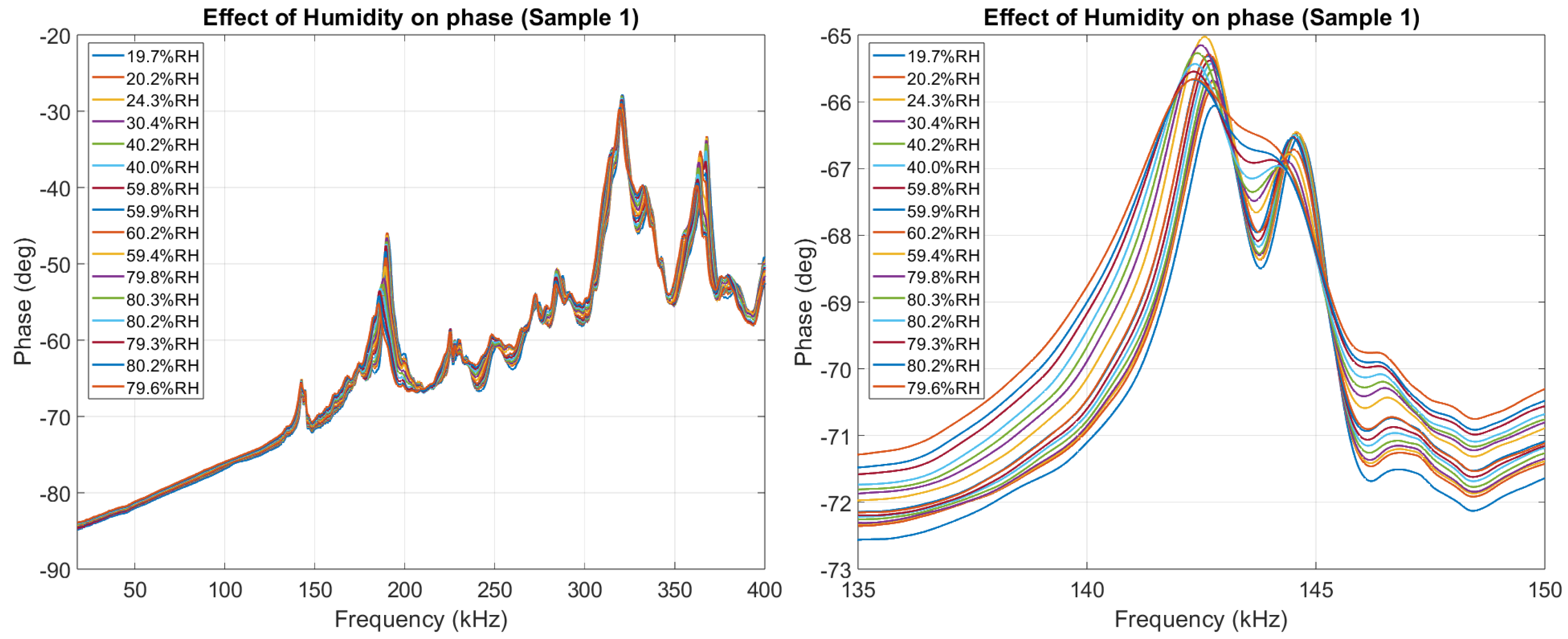 The effect of humidity on the phase of the impedance of Sample 1, highlighting the largest peak appearing between 135 kHz and 150 kHz.