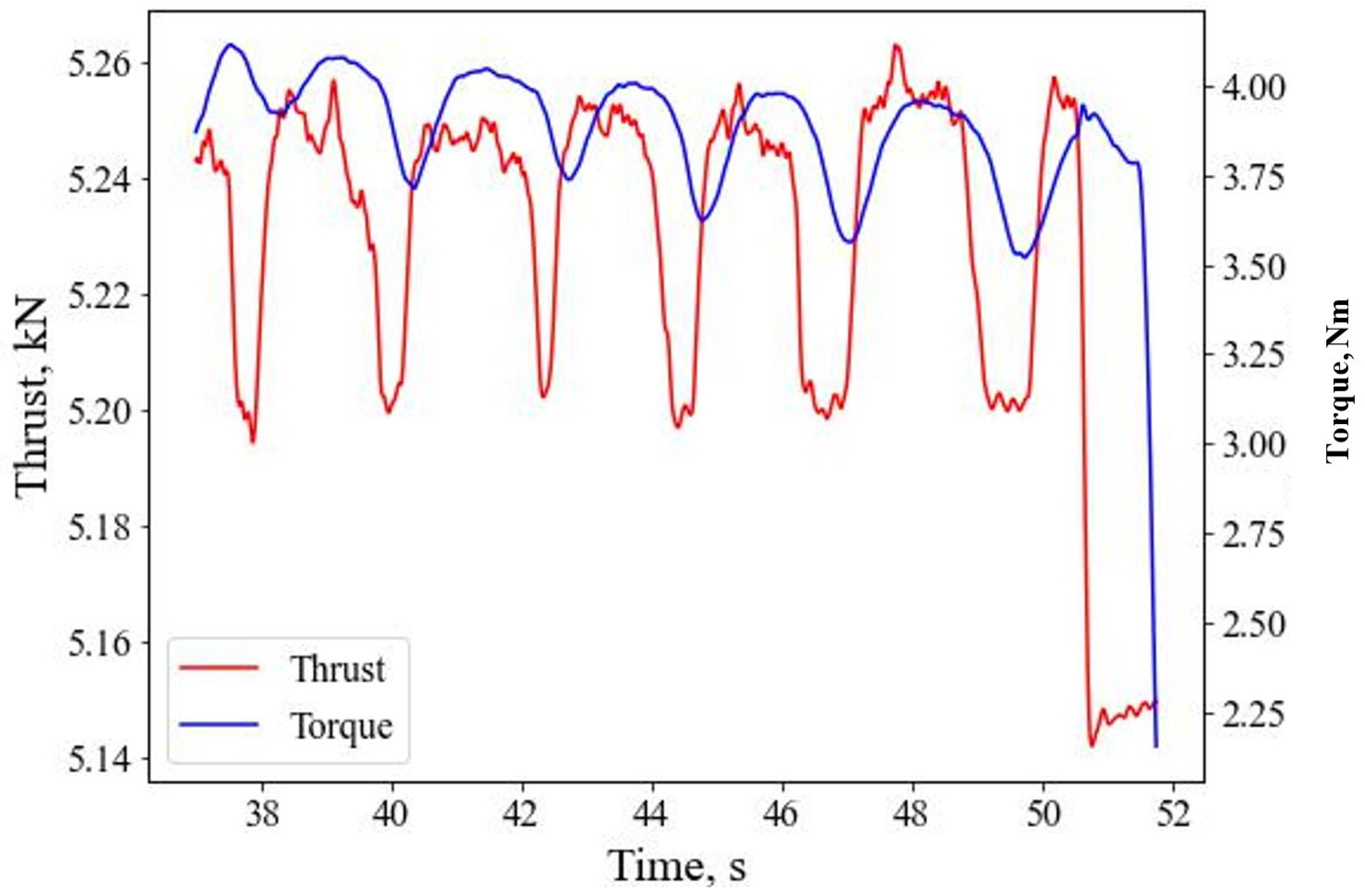 34]. The pavers used in the sample are of the same thickness; hence, the time to each paver is approximately the same. As the relationship between torque and thrust is proportional to each other, the nature of the curves is similar. The slight time shift on the two curves could be due to the time delay in acquiring the signals between the sensors. However, in both curves, it can be noted that various penetrated layers can be easily identified, along with the interfacial distances between the pavers.