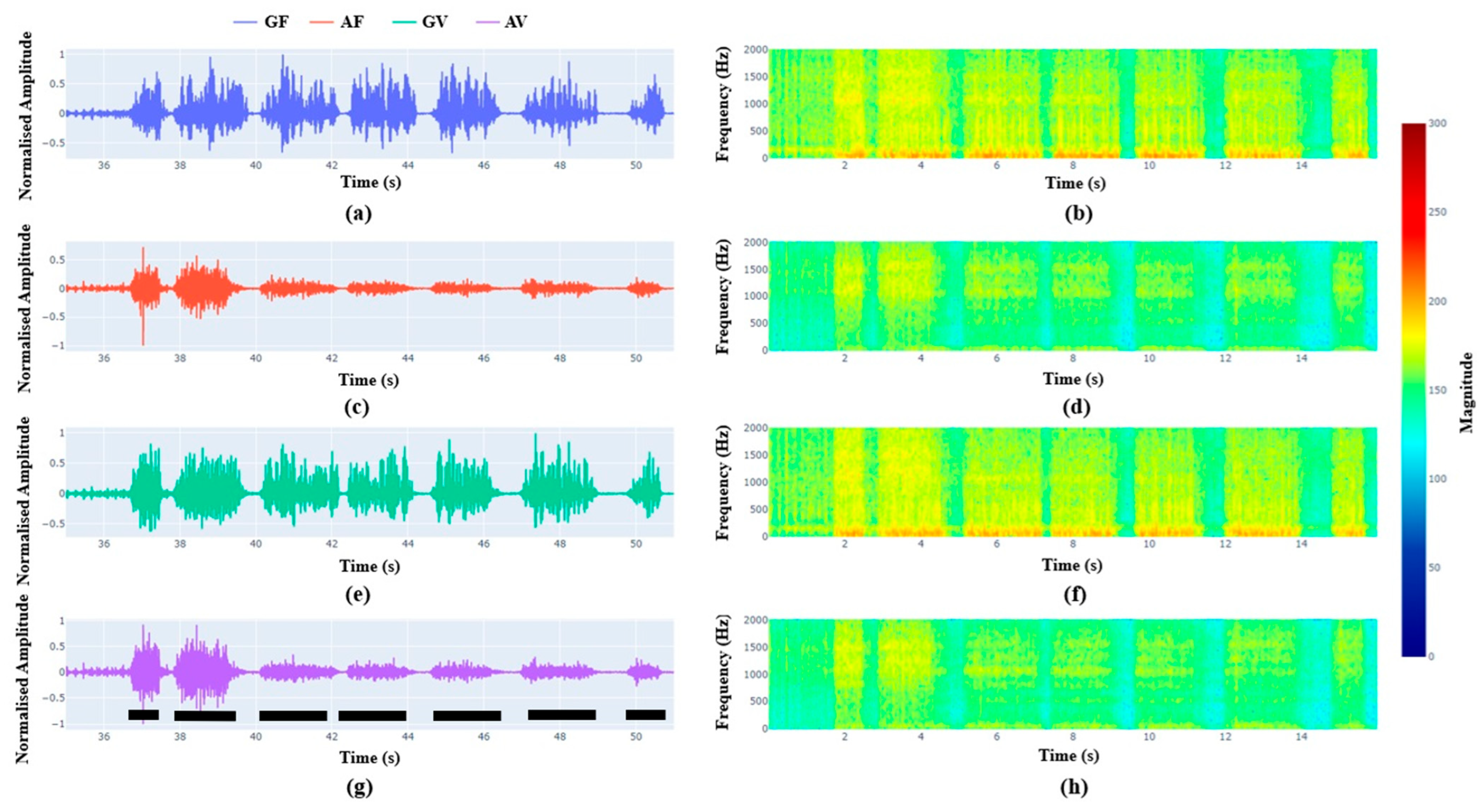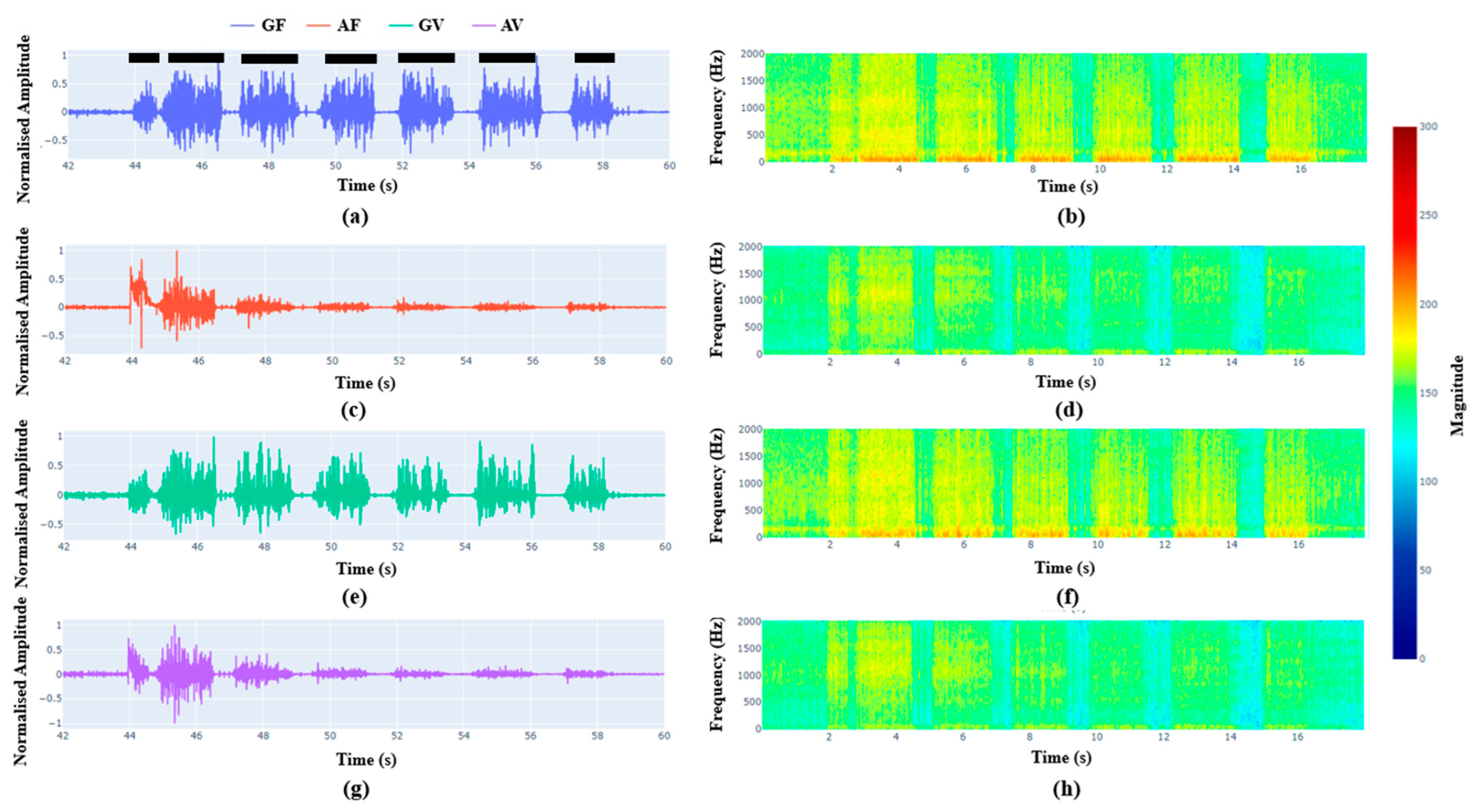 Figure 5a,c shows the geophone signals and accelerometer signals, respectively, obtained from the filled “GF” and void “GV” sides while the drilling is conducted at the filled side. Similarly,