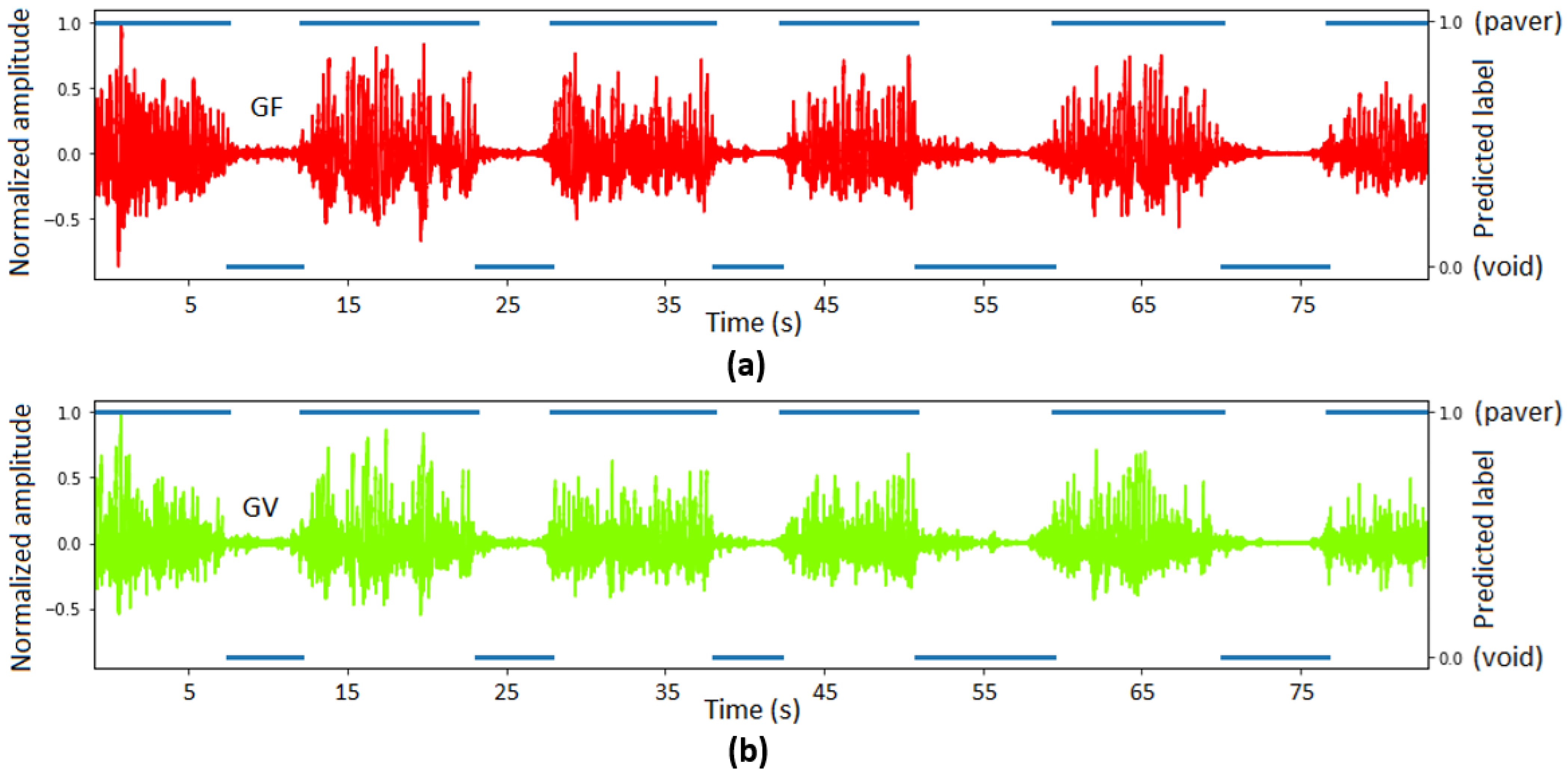 To demonstrate that geophone signals can be used for automatic void identification, the seismic signal (geophone signal) was manually labeled as rock and void with respect to the variations in signal amplitude (
