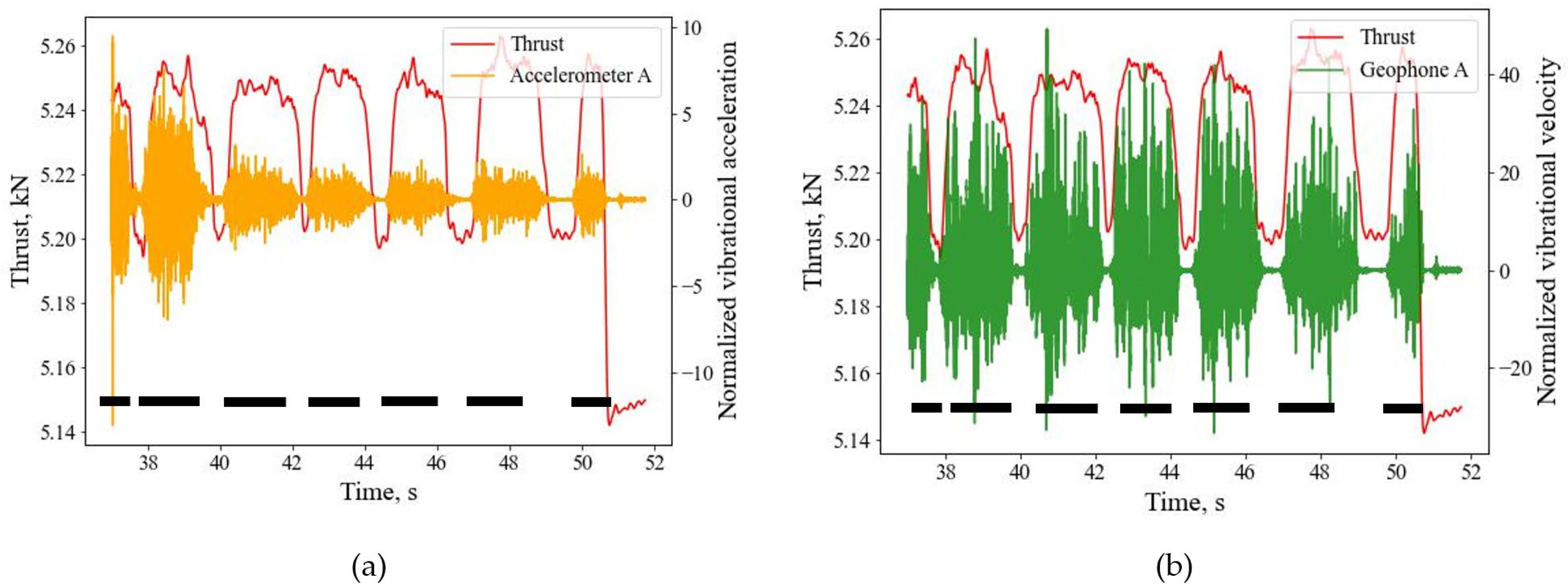 Figure 11 shows the characteristics of thrust, geophone and accelerators from the representative drillings. As thrust and torque are linearly related, only the geophones and accelerometers signals are compared with thrust. The illustrations are referenced with the geophone and accelerometer located at location “A” (