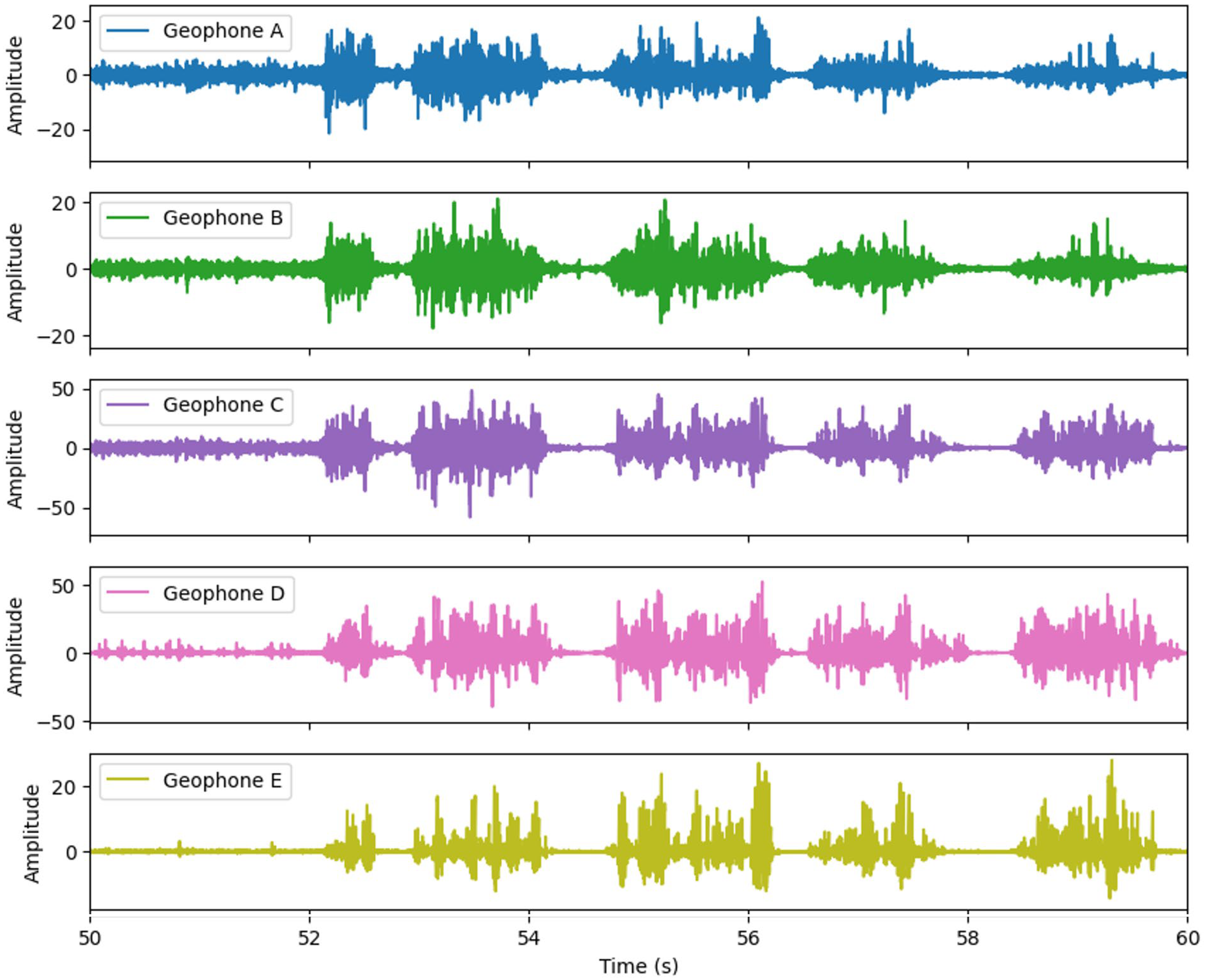 Table 2. Depending on the location of the sensors, the frequency and amplitude seemed to differ. This suggests that the location of the sensors is not an issue, but the intensity of the signals could vary. Therefore, in the current experiment, within the tested condition in the laboratory, the location of the seismic sensors has a lesser impact on interface identification.