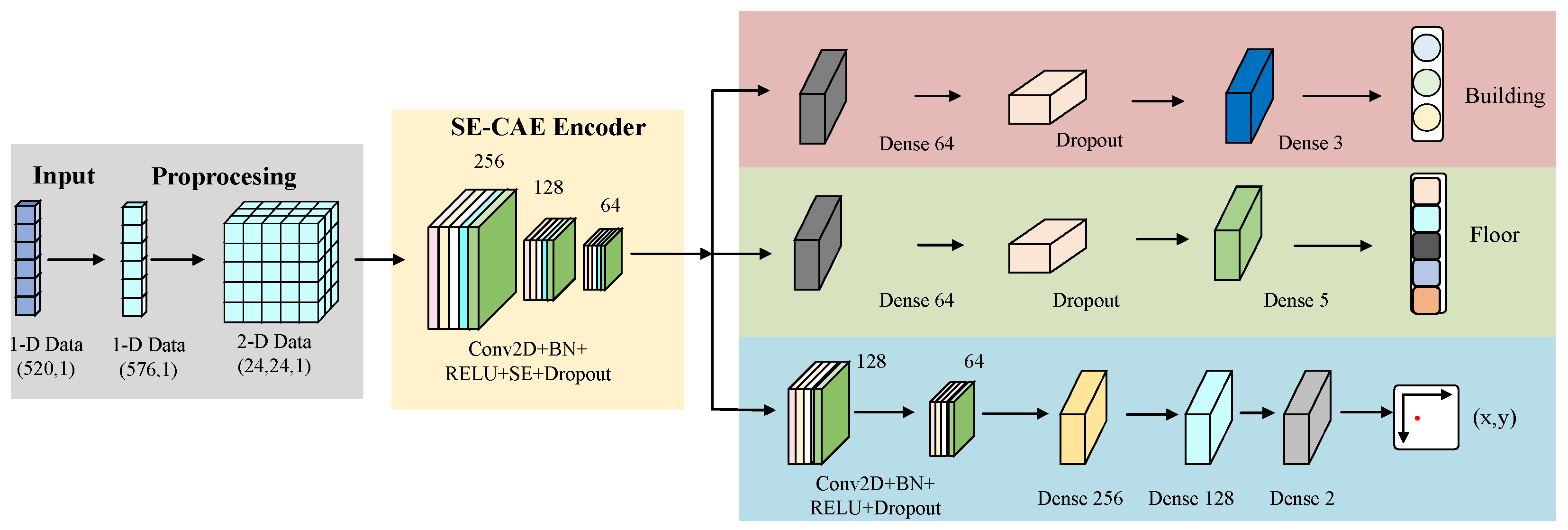 20] extended the SAE technology to multi-building and multi-floor indoor positioning tasks, effectively realizing the dual functions of building/floor classification and position regression.