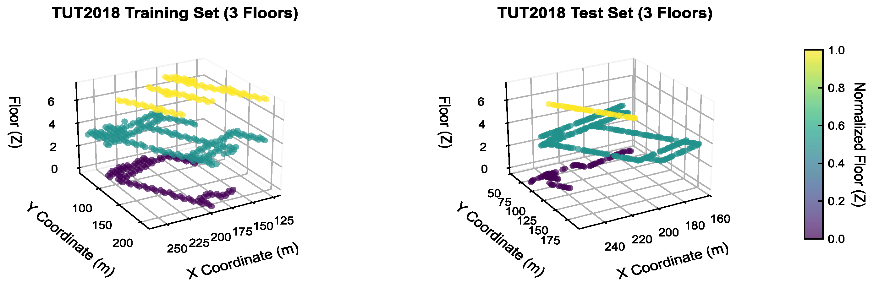 In consideration of the characteristics of the two datasets, UJIIndoorLoc and TUT2018, utilized in this study, the regression algorithm is adjusted deferentially. Specifically, UJIIndoorLoc requires three-level constraints of building-floor-coordinates. By concatenating the embedding vectors of the building/floor classification results with the bottleneck features, the prediction scope is restricted (e.g., confining the signal distribution scope of a specific building–floor combination). In contrast, TUT2018 only includes a single building; therefore, the classification branch is eliminated, and the coordinate scope is directly constrained by the floor classification results (3 floors). The SE module is optimized to capture the signal features related to direction, thereby improving the positioning accuracy in fine-grained scenarios.