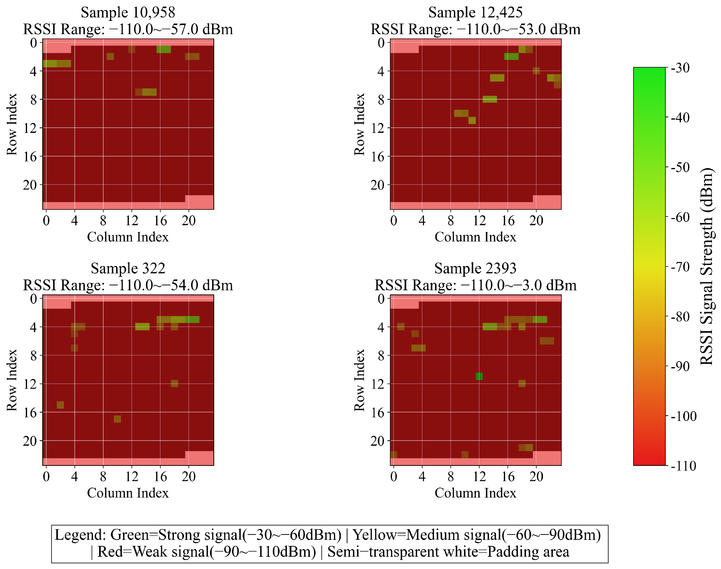 RSSI is distinguished by a comparatively low acquisition threshold, which allows for direct collection via standard Wi-Fi networks. It exhibits the advantages of low deployment costs and high portability, which is in full accordance with the core advantage of reusing existing infrastructure. Conversely, CSI attains centimeter-level positioning through its distinctive capabilities, including capturing phase–amplitude details in multipath propagation, adapting to non-line-of-sight (NLOS) environments, and enhancing fingerprint information through spatial/frequency diversity. Nevertheless, CSI necessitates more intricate data preprocessing, higher hardware specifications, and incurs greater computational overhead owing to its bandwidth-dependent processing [