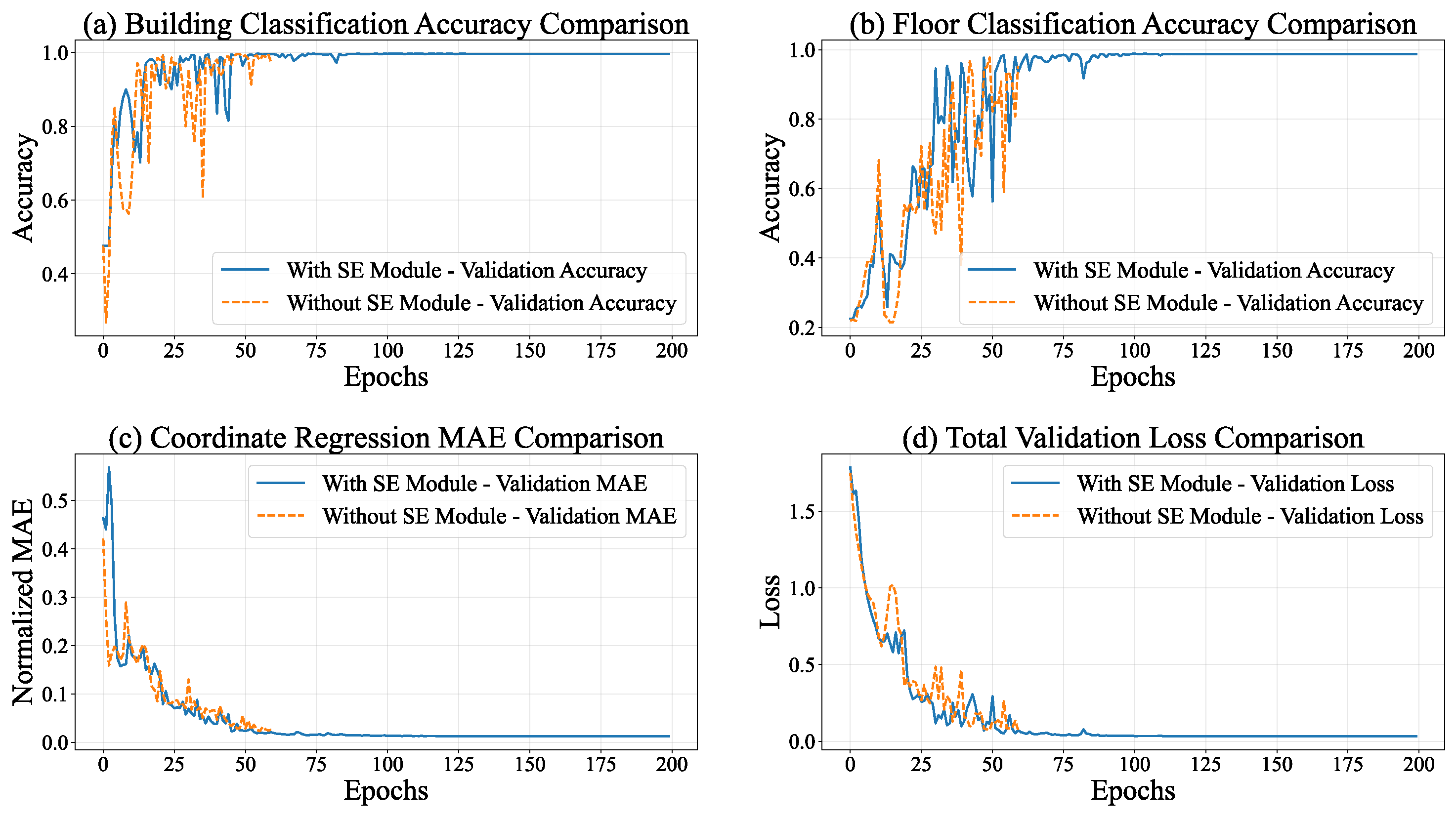 Table 2, the multi-task model integrating the SE module exhibits superior performance in building classification, floor classification, and coordinate regression tasks. Significantly, it attains an accuracy approaching 100% in classification tasks while keeping regression errors at a low level. This implies that the attention mechanism within the SE module effectively strengthens the feature representation capabilities, offering a high-quality shared feature basis for multi-task learning.