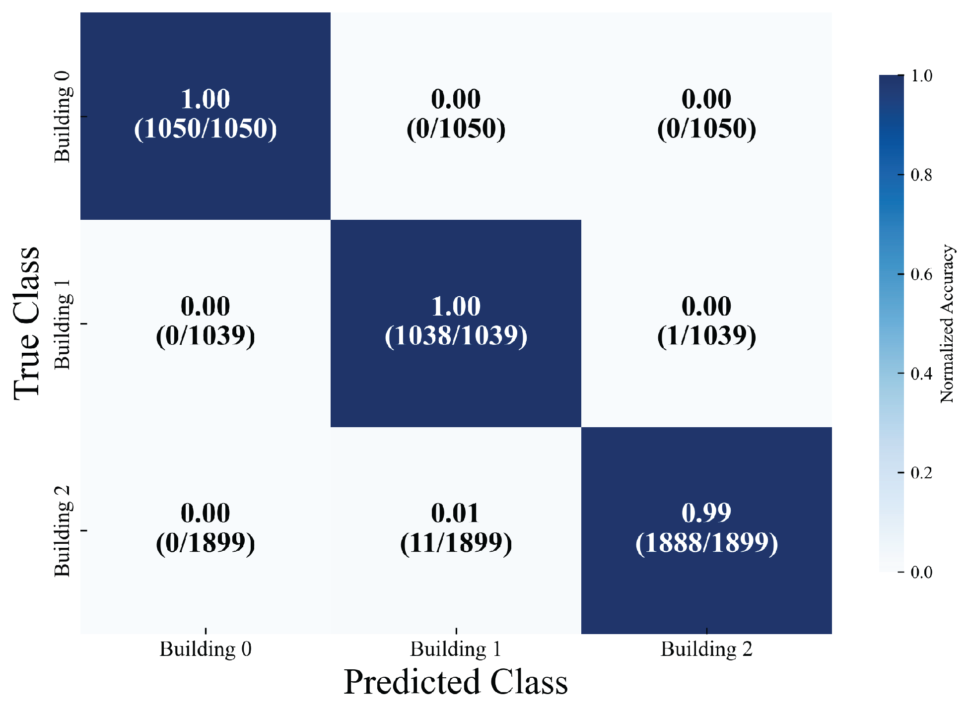 Figure 10, the confusion matrix for building classification further reveals accuracy rates of 100%, 100%, and 99% for the three buildings, respectively.