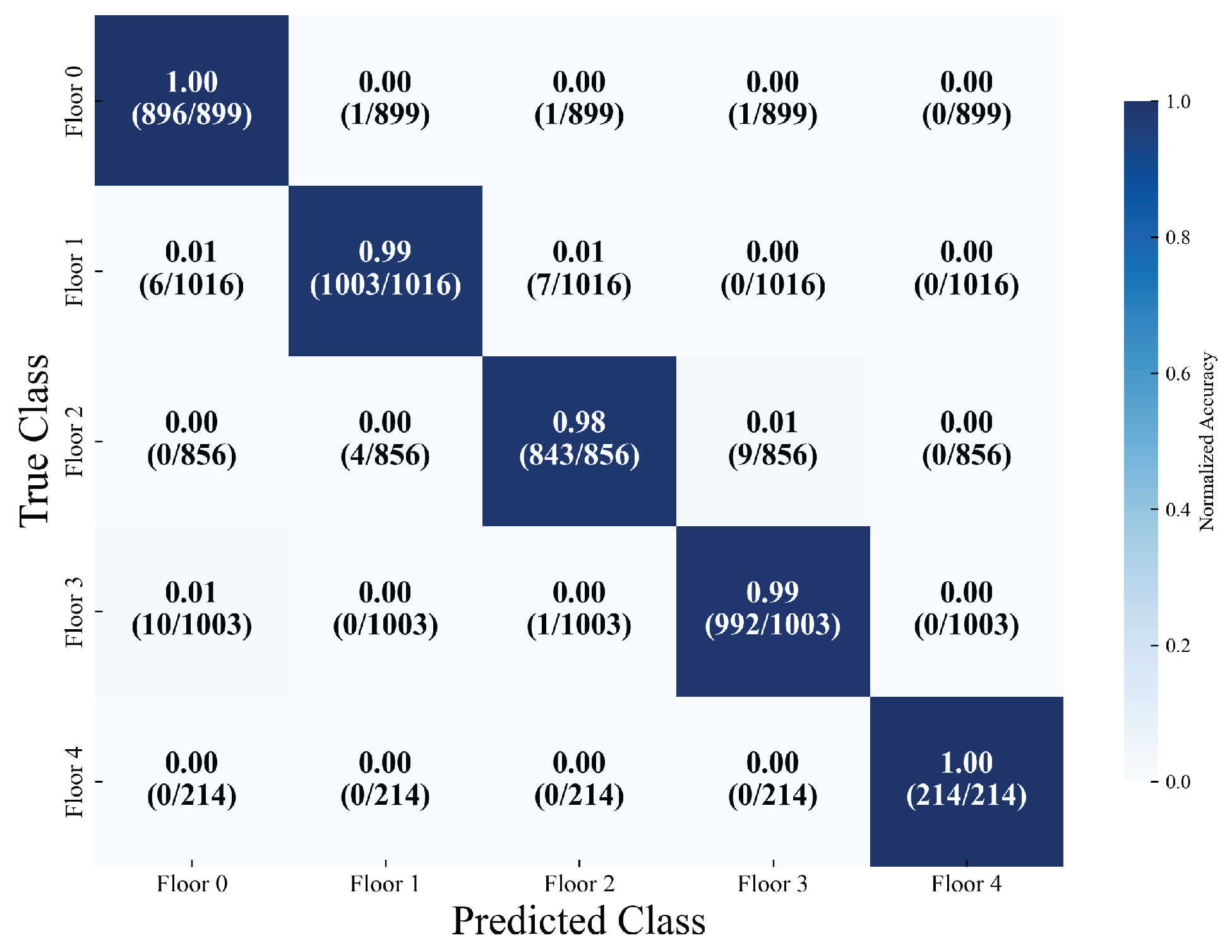 Figure 11, the confusion matrix for floor classification further illustrates accuracy rates of 100%, 99%, 98%, 99%, and 100% for the five-story building, respectively.