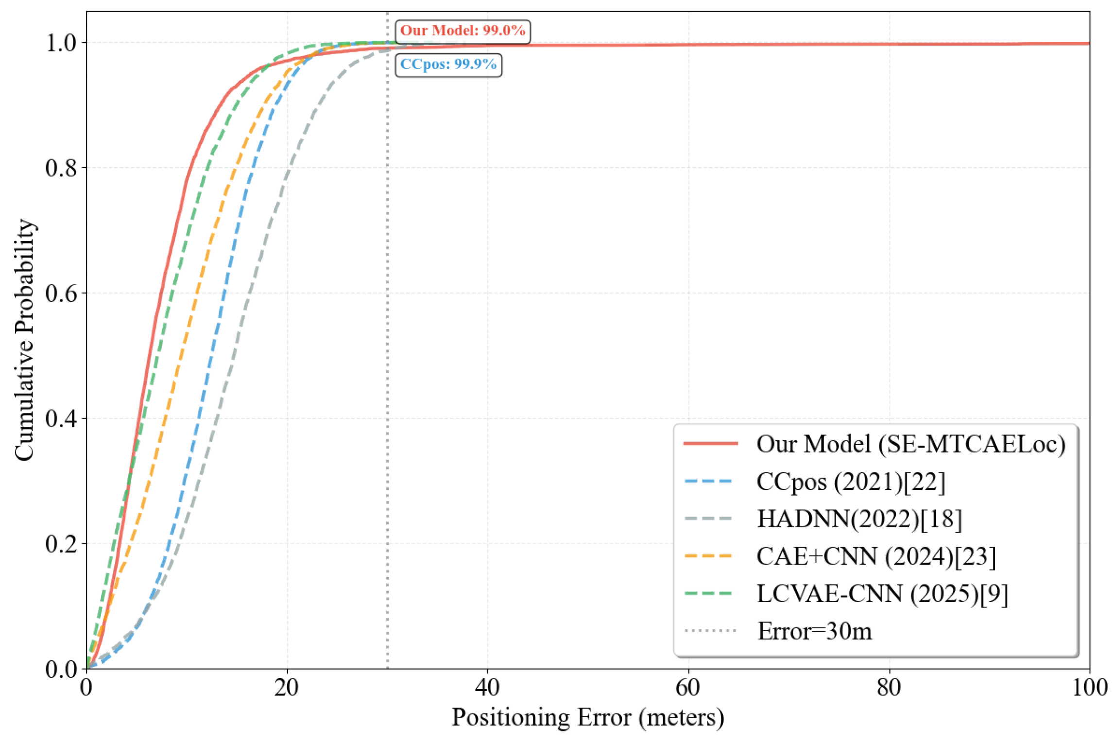 Figure 12, the cumulative distribution function (CDF) of positioning errors further illustrates that the SE-MTCAELoc model manifests a more rapid probability increase within the low-error range (≤20 m), suggesting more rigorous error control for the majority of samples. When the errors are ≤30 m, the model attains a coverage of