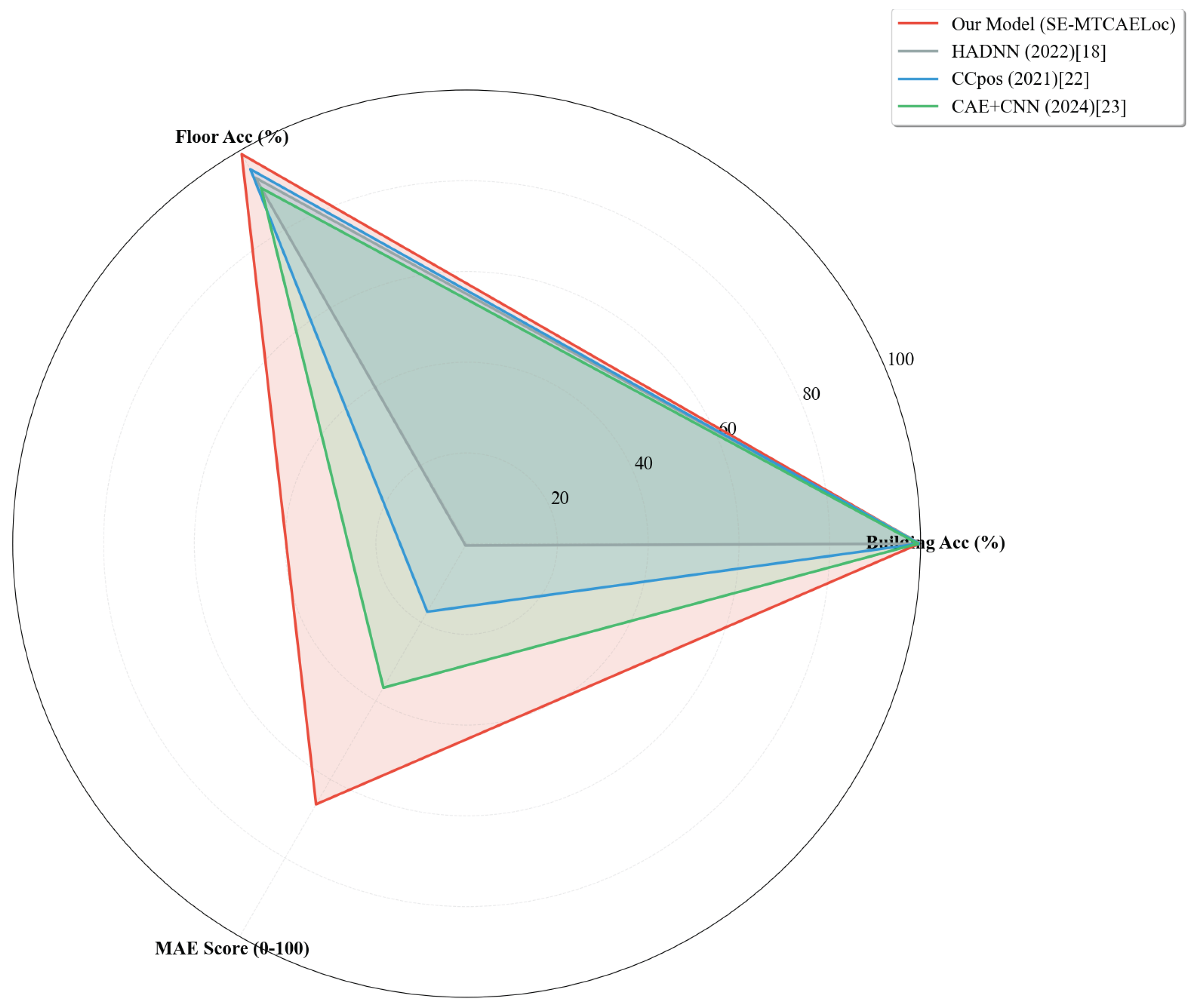 Figure 13, the three-dimensional evaluation dimensions, specifically building, floor classification accuracy, and MAE score, convert the high accuracy of classification tasks and the low error of regression tasks into a unified 0-100-point quantification measure. The MAE score is calculated as