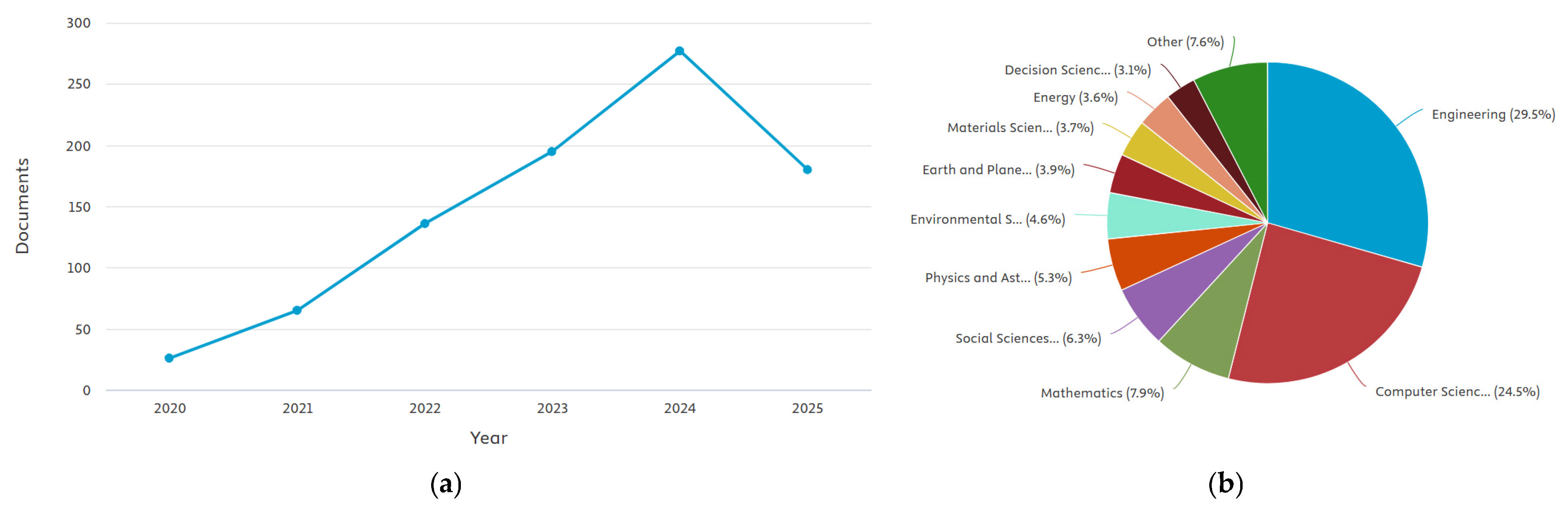 Figure 1, research interest in the application of DT technology to roads has grown rapidly in recent years. Publications retrieved from the Scopus database increased markedly after 2020, reflecting the broader diffusion of DT concepts across the infrastructure and civil engineering domains. Between 2020 and 2024, the number of documents using the keyword “digital twin road” rose from 26 to 277 documents, confirming the accelerating pace of research and development in this field. However, a closer inspection of the subject areas reveals that most studies focus on transportation engineering, computer science, and construction management, while relatively few address the integration of DTs within the urban context. This imbalance highlights that, despite the growing maturity of DT applications for highways and controlled testbeds, city-scale road systems remain a largely unexplored domain.