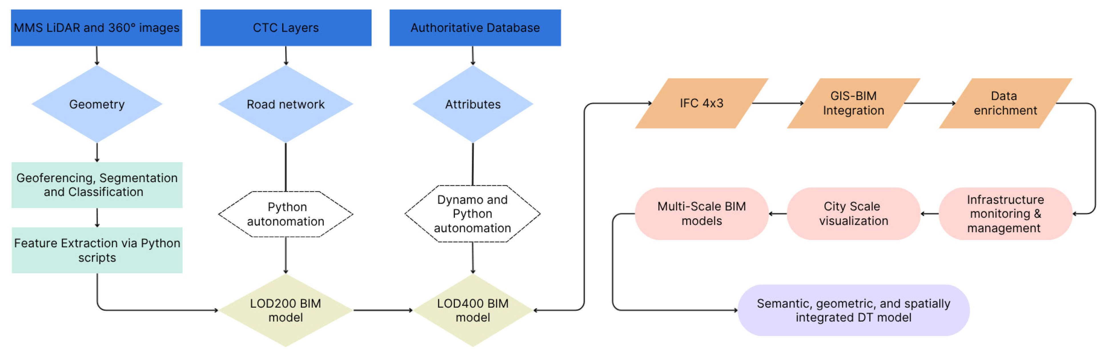 While multi-modal (LiDAR, imagery, GIS), multi-scale (LoD 200–400), and multi-level (city–road–asset) integration are essential characteristics of many DT architectures, it is important to clarify that these components alone do not constitute a fully functional DT. Rather, they establish the foundational data infrastructure necessary for enabling continuous updates, real-time communication, and decision-support processes.
