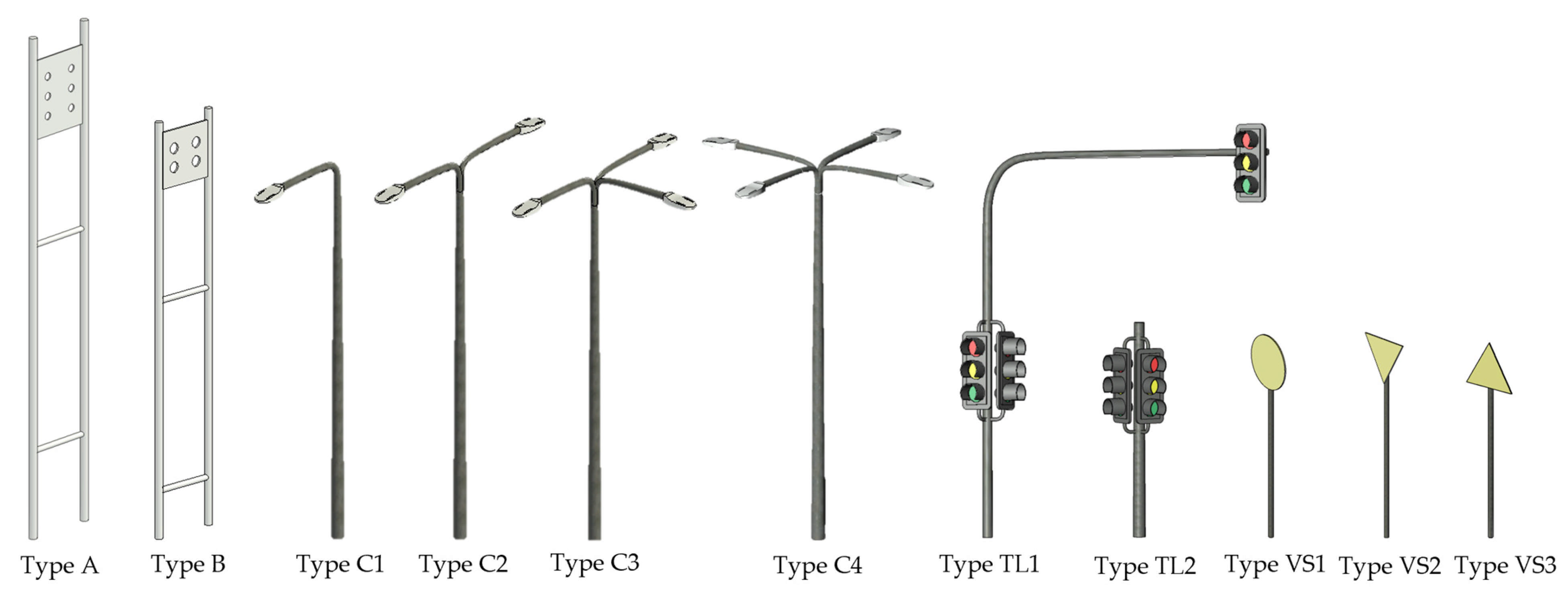 The proposed workflow produces several actionable deliverables that directly support urban road monitoring and maintenance. First, the automated segmentation pipeline extracted 1178 streetlights, 932 traffic signs, and 236 traffic-light poles, each represented as an IFC object enriched with geometric attributes and location. These elements constitute a structured and machine-readable asset inventory, fully compatible with municipal GIS datasets and BIM environments.