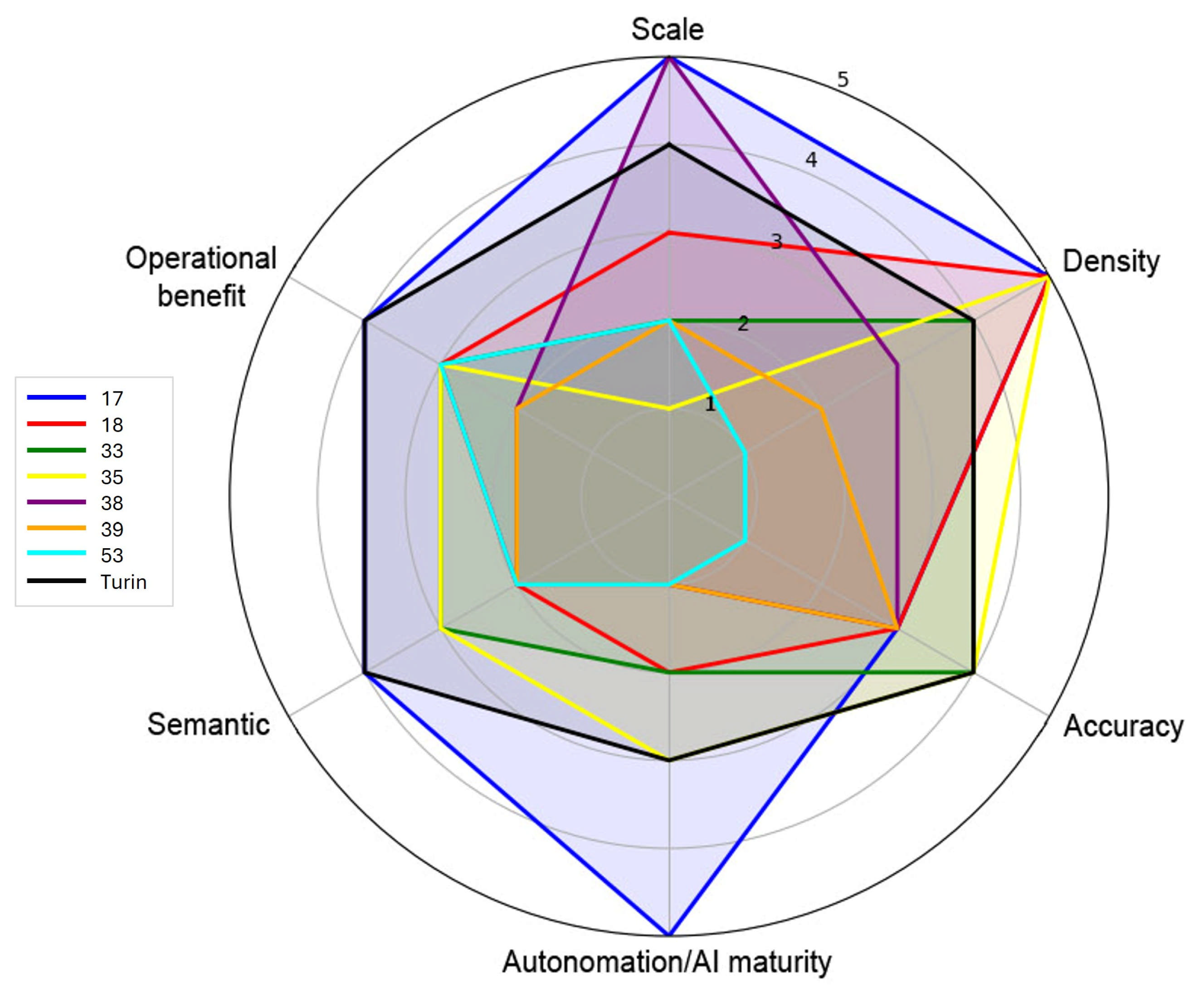 Figure 12). The figure provides a normalized visualization of the six key dimensions analyzed—scale, point cloud density, accuracy, automation level, semantic richness, and operational benefit—allowing the relative strengths and limitations of each case to be directly compared. By placing all studies within a common multidimensional framework, the radar plot highlights the diverse operational profiles of DT-based workflows, ranging from large-scale, highly automated highway applications to small-scale, high-precision structural monitoring. The positioning of the Turin case illustrates its balanced configuration, with above-average accuracy, high semantic richness, and strong DT-readiness, distinguishing it from both large-scale but lower-accuracy deployments and highly precise but non-scalable asset-specific surveys. Overall, the figure visually reinforces the findings of the contrastive analysis and supports the identification of methodological gaps and complementarities across the current literature.