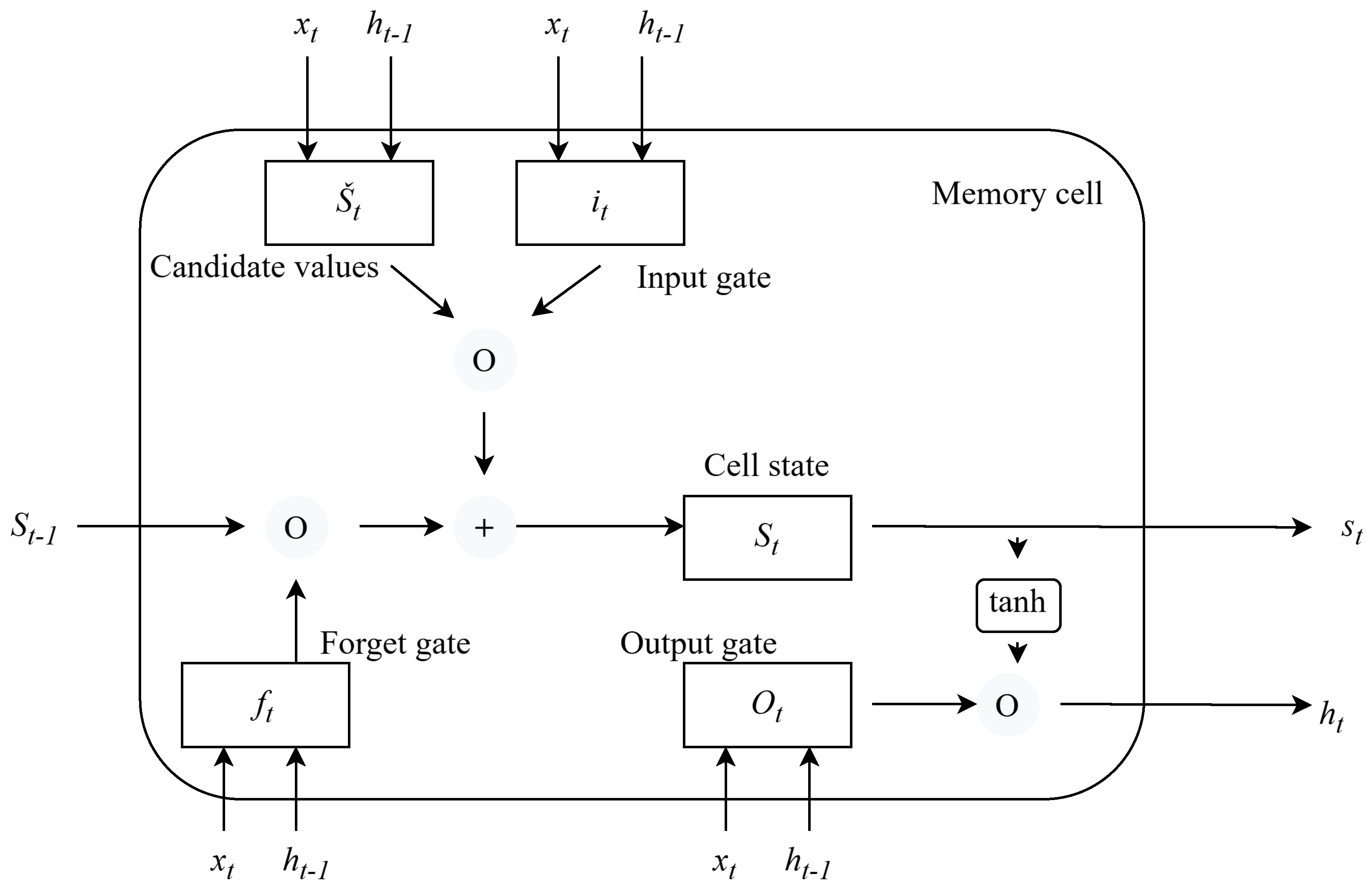 Candidate Value ( S ˜ t ): Creates a vector of potential new values that could be added to the state. It uses the hyperbolic tangent function (tanh) to scale the potential new values between −1 and 1. The output of i t is multiplied (element-wise) with S ˜ t .