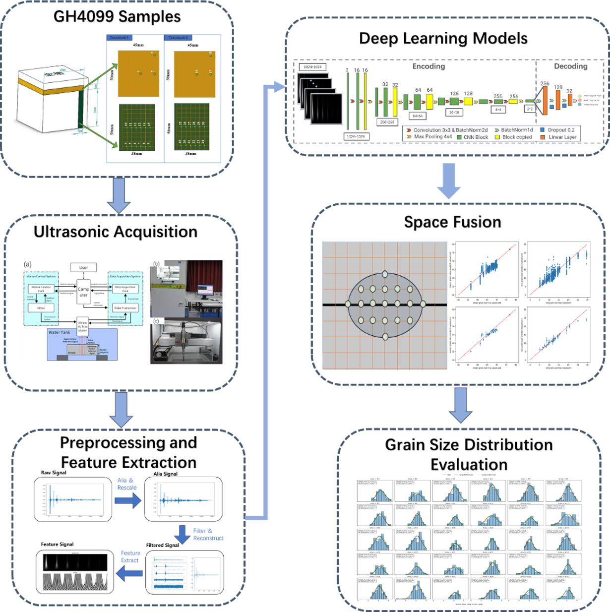 - Multimodal ultrasonic features with time–frequency encoding and an encoder–decoder model, aided by elliptic spatial fusion, enable grain size distribution prediction for GH4099.