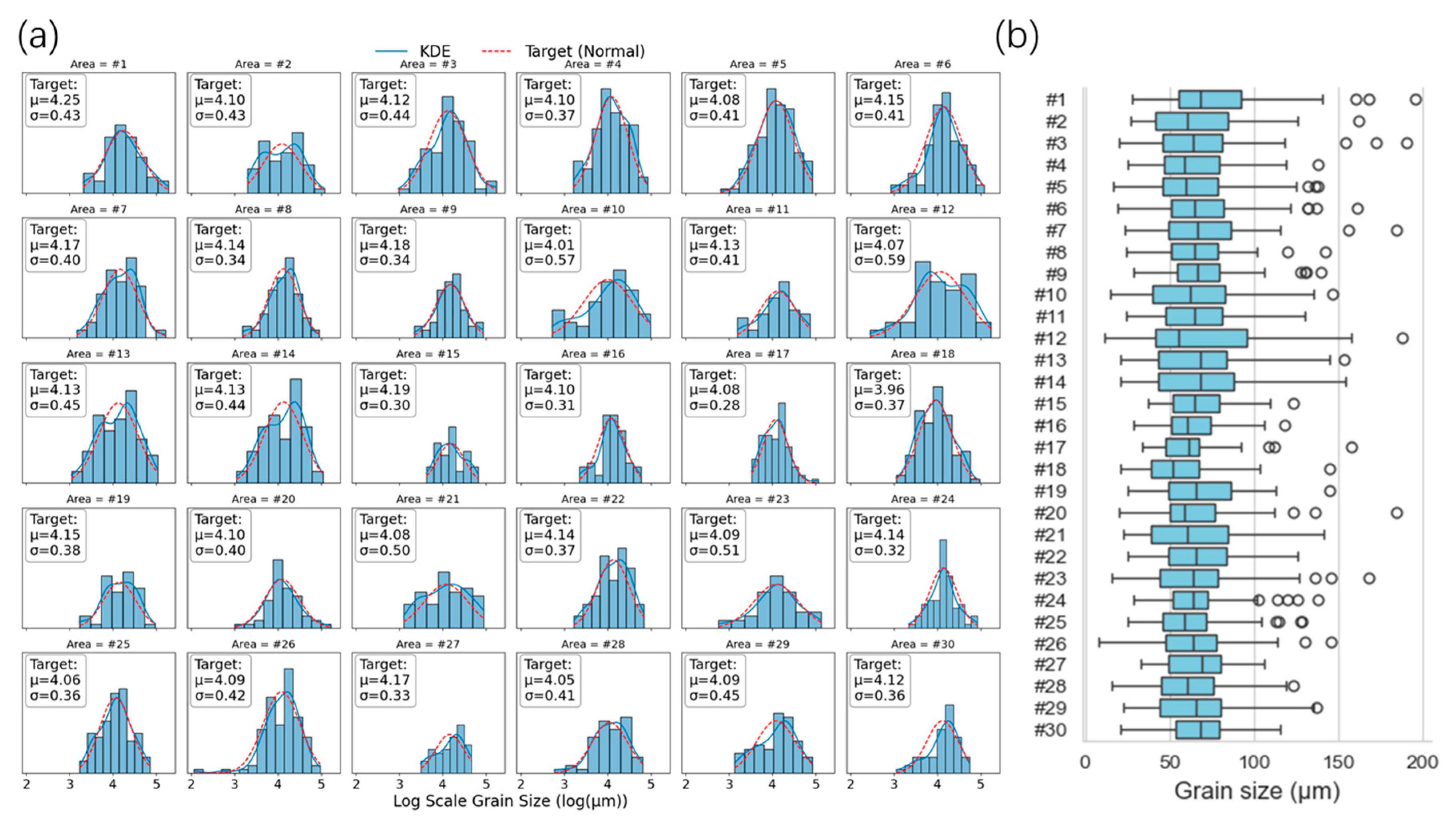 - When samples #12 and #15 are used as training samples, their KL divergence values are large, likely due to large relative errors in predicted standard deviation. In particular, sample #12 shows a large absolute error in distribution prediction. This may arise from a large standard deviation in grain size, which increases local heterogeneity and makes characterization by a single grain-size type insufficient. To address these limitations, future work could replace the simple spatial averaging strategy (Equation (11)) with an attention-weighted fusion mechanism. By assigning higher weights to ultrasonic signals that exhibit higher local entropy or distinct scattering patterns, the model could better focus on anomalous grain structures. Additionally, adopting a finer-grained scanning grid (e.g., reducing the 0.5 mm step) or using multi-scale convolutional kernels in the encoder could help extract localized microstructural gradients that are currently smoothed out by global compression.