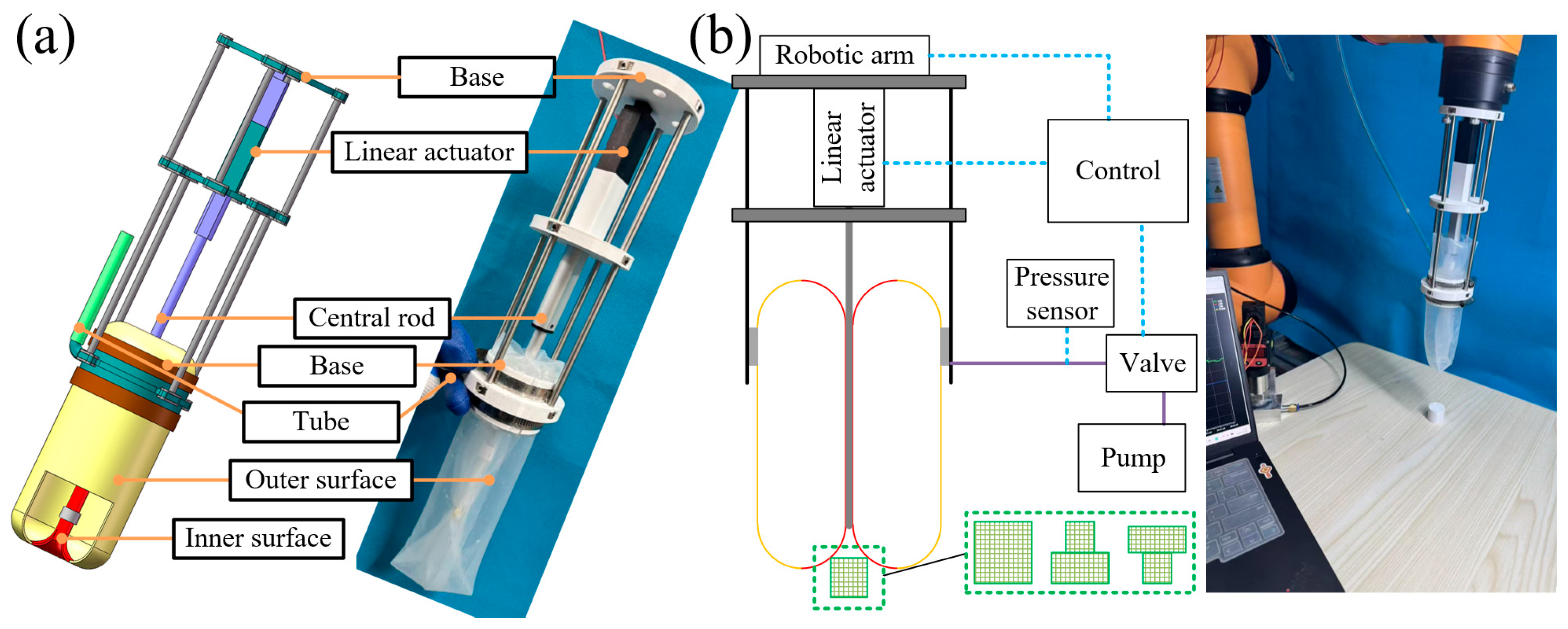 - Hao, Y.; Biswas, S.; Hawkes, E.W.; Wang, T.; Zhu, M.; Wen, L.; Visell, Y. A Multimodal, Enveloping Soft Gripper: Shape Conformation, Bioinspired Adhesion, and Expansion-Driven Suction. IEEE Trans. Robot. 2021, 37, 350–362. [Google Scholar] [CrossRef]