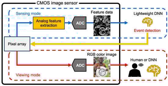 In the present Internet of Things (IoT) era, big data from a vast number of sensors in the physical space is transmitted to cyberspace, where artificial intelligence (AI) processes it and provides feedback to the physical space [1]. To achieve high accuracy in image recognition, Deep Neural Network (DNN) models [2,3,4,5,6] trained with large-scale datasets [7,8,9,10,11] are widely utilized. However, for sustainability purposes, it is important to reduce the power consumption of image recognition systems composed of sensors and AI. In the field of image sensing, CMOS image sensors suitable for AI applications, known as sensing image sensors, have emerged as a promising solution. Conventional RGB color image sensors generate high-resolution photographic images for viewing. Since these images typically contain redundant data that AI removes during feature extraction, sensing image sensors capable of outputting lightweight feature data suitable for AI tasks offer a promising approach to reducing the power consumption of image recognition systems and the storage requirements for massive imaging data [12,13,14,15]. A log-gradient QVGA image sensor [12] outputs feature data in the form of histograms of oriented gradients (HOGs). However, as its readout circuitry is specifically designed for HOG extraction, it cannot produce conventional photographic images. A convolutional image sensor [13] can provide both photographic images and feature outputs; however, it requires in-pixel capacitors to perform multiply–accumulate (MAC) operations. This design results in larger pixel areas, which can degrade light sensitivity and increase fabrication costs. Event-based vision sensors (EVSs) [14,15] are designed to reduce spatial redundancy and enable high dynamic range imaging with compact feature representations. Nevertheless, they face challenges in capturing stationary objects because small luminance variations (those that fall below or rise above a preset threshold [16,17]) are ignored to avoid redundancy. Furthermore, the in-pixel circuits required to detect temporal variations lead to an increase in pixel size.