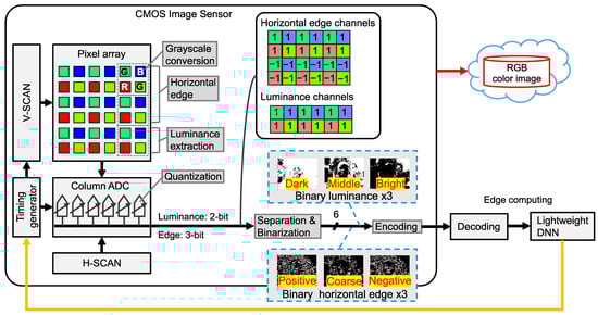 Figure 2 shows a more detailed depiction of the system illustrated in Figure 1. The RGB color image is read out using a pixel-by-pixel architecture at an 8-bit resolution, similar to conventional RGB color image sensors. Feature extraction proceeds as follows: First, using its four-shared pixel structure, the sensor bins the RGGB Bayer pixel signal to convert it into a grayscale signal using the formula [24]. This simultaneous readout of photoelectrons from the Bayer array reduces the spatial resolution to one-fourth. Next, instead of performing correlated double-sampling on a single pixel, the horizontal edge is extracted by subtracting the signals from vertically adjacent Bayer cells. This subtraction is realized using a five-transistor (5T) pixel architecture [24,25], which incorporates a vertical binning transistor into the conventional four-transistor (4T) pixel structure. Besides the edge signal, the luminance signal is extracted from Bayer cells adjacent to the horizontal edge extraction cells. Horizontal edge extraction and luminance extraction reduce the spatial resolution to two-thirds, outputting two-channel analog feature data. The analog feature data, consisting of the luminance and horizontal edge signals, is quantized to 2-bit and 3-bit, respectively. We focus on horizontal edges rather than vertical edges because horizontal edge features can be extracted within the pixel array of our proposed CMOS image sensor [26]. Subsequently, the 2-bit luminance signal is separated into three channels of 1-bit luminance signals, representing the dark, middle, and bright regions, respectively. Similarly, the 3-bit horizontal edge signal is separated into three channels of 1-bit horizontal edge signals, representing the fine positive gradients, coarse gradients, and fine negative gradients, respectively. This separation reduces bit transitions within each channel, thereby improving compression efficiency. Quantization, separation, and binarization reduce the total bit resolution to six-eighths compared to the 8-bit RGB color image. Finally, the six-channel binary feature data is compressed using lossless RLE. These processing steps reduce the output data size from the sensor, thereby lowering power consumption [18]. The encoded binary feature data is then decoded and processed using the lightweight DNN model. The proposed on-chip signal compression method of the CMOS image sensor, including six-channel binary feature extraction and tailored RLE, is described in the following sub-sections.