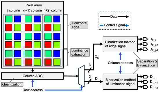 Figure 3 shows the pipeline of the proposed six-channel binary feature separation and binarization. The analog feature data of the horizontal edge and luminance signals extracted from the pixel array are converted into the six-channel binary feature data through quantization by ADCs, followed by separation and binarization using logical operations. Specifically, the analog feature data are quantized by column-parallel ADCs in a row-by-row manner. The horizontal edge signal is quantized to 3 bits and the luminance signal to 2 bits, as described in Section 2.2.1. Subsequently, logical operations described in Section 2.2.2 are sequentially applied to the horizontal edge and luminance signals. For the three columns of 2-bit luminance signals, the -th, -th, and -th columns are converted into binary luminance signals representing the dark regions , the middle regions , and the bright regions , respectively. Similarly, the three columns of horizontal edge signals are converted into binary horizontal edge signals representing the fine positive gradients , the coarse gradients , and the fine negative gradients , respectively. Consequently, assuming a Bayer pixel array, each of the resulting feature channels consists of pixels.