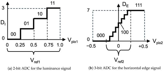 Figure 7 shows the ADC-based quantization process for analog feature data, based on the histogram characteristics of the luminance and horizontal edge signals. As shown in Figure 7a, the analog luminance signal is converted into a 2-bit digital signal with a reference voltage range of , resulting in a quantization step of . Regarding the analog horizontal edge signal, since the distribution is concentrated around the center, the ADC reference voltage is set to a narrow range centered at 0 V, as shown in Figure 7b. Consequently, the analog edge signal is converted into a 3-bit digital signal . For instance, when the reference voltage is set to , two pixels with and are quantized into the same luminance value . However, the voltage difference is captured by the edge signal , representing a positive gradient. In this strategy, the edge signal resolves fine luminance variations that are indistinguishable using the luminance signal alone.