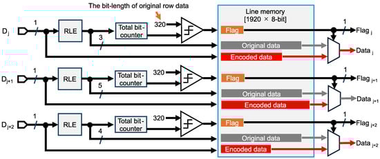 Data flow diagram of run length encoding for the binary feature data to avoid expansion. Separated feature data in the j-th, (j+1)-th, and (j+2)-th columns are denoted as , , and , respectively.