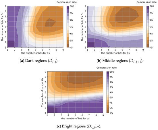 Regarding luminance signals, we found that allocating balanced fixed-bit counters for 0s and 1s yields the minimum compression rates. This is because luminance signals capture the global signal intensity where bit transitions are suppressed due to the spatial correlation between horizontally adjacent pixels. In contrast, the compression rates of horizontal edge signals are minimized when allocating a larger bit width for 0s (denoting the absence of an edge gradient) compared to 1s (denoting the presence of an edge gradient). This occurs because horizontal edge signals capture local intensity changes. Since these changes appear sparsely, and the run length of 1s is significantly shorter than that of 0s. Compared to the case where , improved compression efficiency (a lower compression ratio) was achieved when . This improvement occurred because increasing reduces sensitivity to small edges, thereby increasing the proportion of consecutive 0s that represent the absence of a gradient. As a result, the average compression rates for all six channels of binary feature data were calculated to be 46.5% for and 37.5% for .