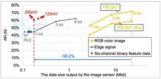 Figure 14 shows the object recognition accuracy () and data sizes for our lightweight YOLOv7 model trained on feature data [20]. For reference, the accuracy of the YOLOv7 and YOLOv7-tiny models trained on RGB color images is also plotted. The feature data includes six-channel binary feature data generated by the proposed method and edge-only signals from our previous works [19,20]. The input layer resolution of all models was matched to the resolution of the proposed sensor output feature data. For the six-channel binary feature data, the plotted data size reflects the size after compression using the tailored RLE method. The results indicate that the six-channel binary feature data achieved a superior trade-off between recognition accuracy and data size. Detailed numerical results are provided in Table 6, Table 7 and Table 8. The COCO dataset with 80 object categories is utilized for validation. Compared to the 3-bit edge signal, the size of the six-channel binary feature data with was reduced by 58.7%, and object recognition accuracy was improved by 3.7% (). Furthermore, compared to conventional 8-bit RGB color images and YOLOv7-tiny, the feature data with improved object recognition accuracy by 2.0% () while reducing the data size by 99.2%. Notably, our lightweight YOLOv7 model trained on six-channel features has approximately the same number of parameters as YOLOv7-tiny, with a reduction of 0.3 M. In addition, the FLOPs are reduced by 8.3 G () compared to YOLOv7-tiny, primarily due to the difference in the spatial resolution between the RGB color image and feature data.