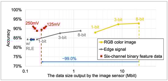 Figure 15 shows the image classification accuracy and data size for the MobileNetV3 model trained on quantized RGB color images and feature data generated from the VWW dataset. The feature data include six-channel binary feature data generated by the proposed method and edge-only signals from our previous works. Since image classification typically requires lower resolution than object detection, all image data were resized to pixels instead of using the raw sensor output resolution. For the six-channel binary feature data and the previous 1-bit edge signal, the plotted data size reflects the size after compression using the tailored RLE method. The training process and learning curves for each data format are detailed in Appendix B. Detailed numerical results are provided in Table 9 and Table 10. The simulation results show that the six-channel binary feature data yielded superior image classification accuracy, similar to the object detection task using the YOLOv7 models and the COCO dataset. Compared to the 8-bit edge signal, six-channel binary feature data with reduced the feature data size by 84.5%, and image classification accuracy improved by 0.5%. Furthermore, compared to conventional 8-bit RGB color images, the six-channel binary feature data reduced the data size by 99.0% at the cost of a 3.4% accuracy degradation. Evaluation on the WV dataset showed similar trends, confirming the robustness of the proposed features against label noise.