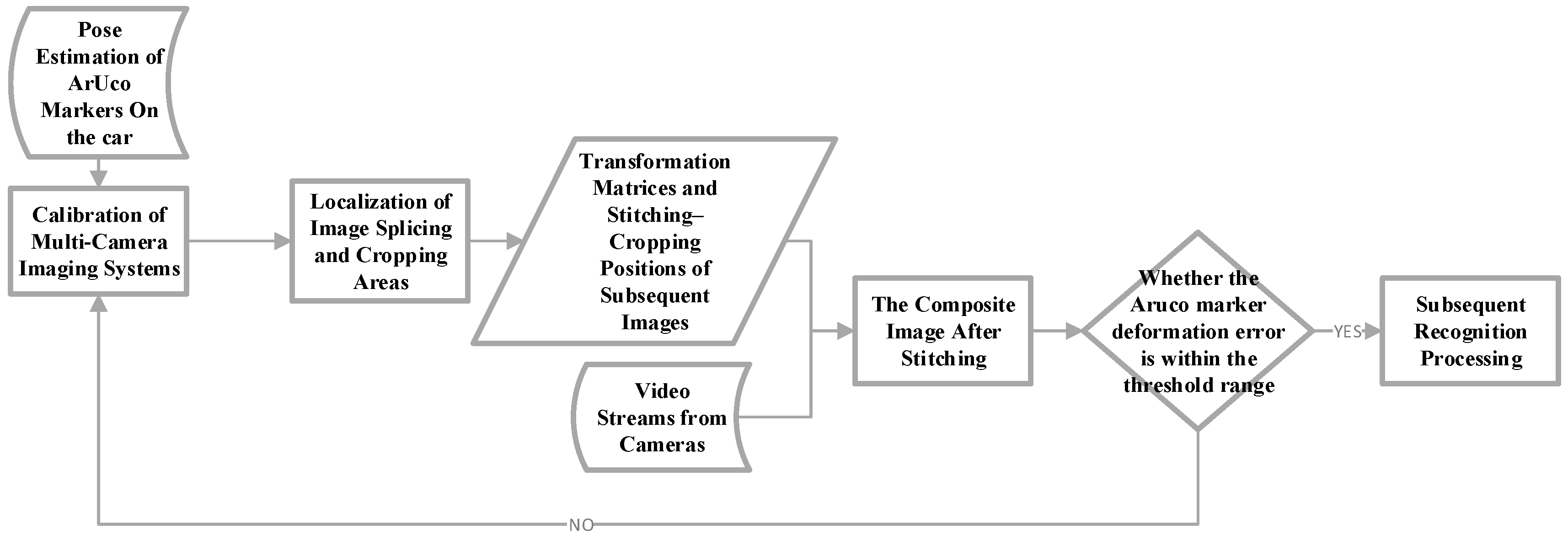 Considering that external disturbances and environmental changes during system operation may cause the preprocessed calibration data to become invalid, additional robustness mechanisms are introduced. Specifically, after the stitching is completed, the system continuously monitors the alignment and recognition status of the identification codes. If the stitched Aruco codes cannot be correctly detected during runtime, the system automatically recomputes the perspective transformation matrix and the cropping/stitching parameters to dynamically update the relevant configuration, ensuring consistent stitching performance.