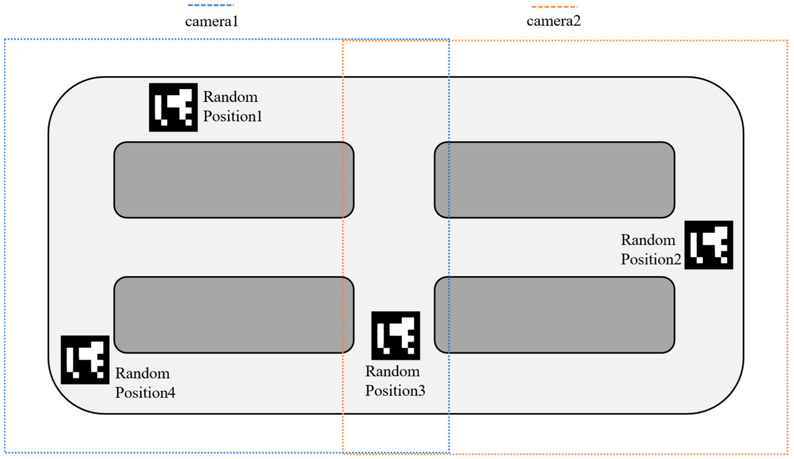 The purpose of image rectification is to eliminate errors and align the images onto a single plane. The implementation process is as follows: when a vehicle carrying an ID marker moves to a random position, the coordinates of the marker’s four corner points are detected. By comparing these coordinates with the actual side lengths of the marker, the initial homography matrix for rectification is calculated. Subsequently, several similar rectification iterations are performed on the rectified images to enhance accuracy. This process continues until the errors of the ID marker, measured at multiple random positions in the final rectified image, fall within the preset threshold range.