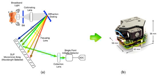 A notable example of miniaturised NIR devices is the DLP® NIRscan™ Nano Spectrometer [4]. This device is based on a digital micromirror device (DMD) designed by Texas Instruments, combining a light detector and a grating. It uses digital light processing (DLP) technology according to the principle of a monochromator. Figure 2 illustrates the architecture of the spectrometer based on DLP technology. The key component is the DMD microarray. This consists of a matrix of thousands of micromirrors, each of which has a surface angle that can be controlled by applying a voltage. Individual wavelengths are selected by turning columns of mirrors on or off to reflect only the desired wavelengths to the detector. This technology enables a larger detector area and the use of a single light detector.