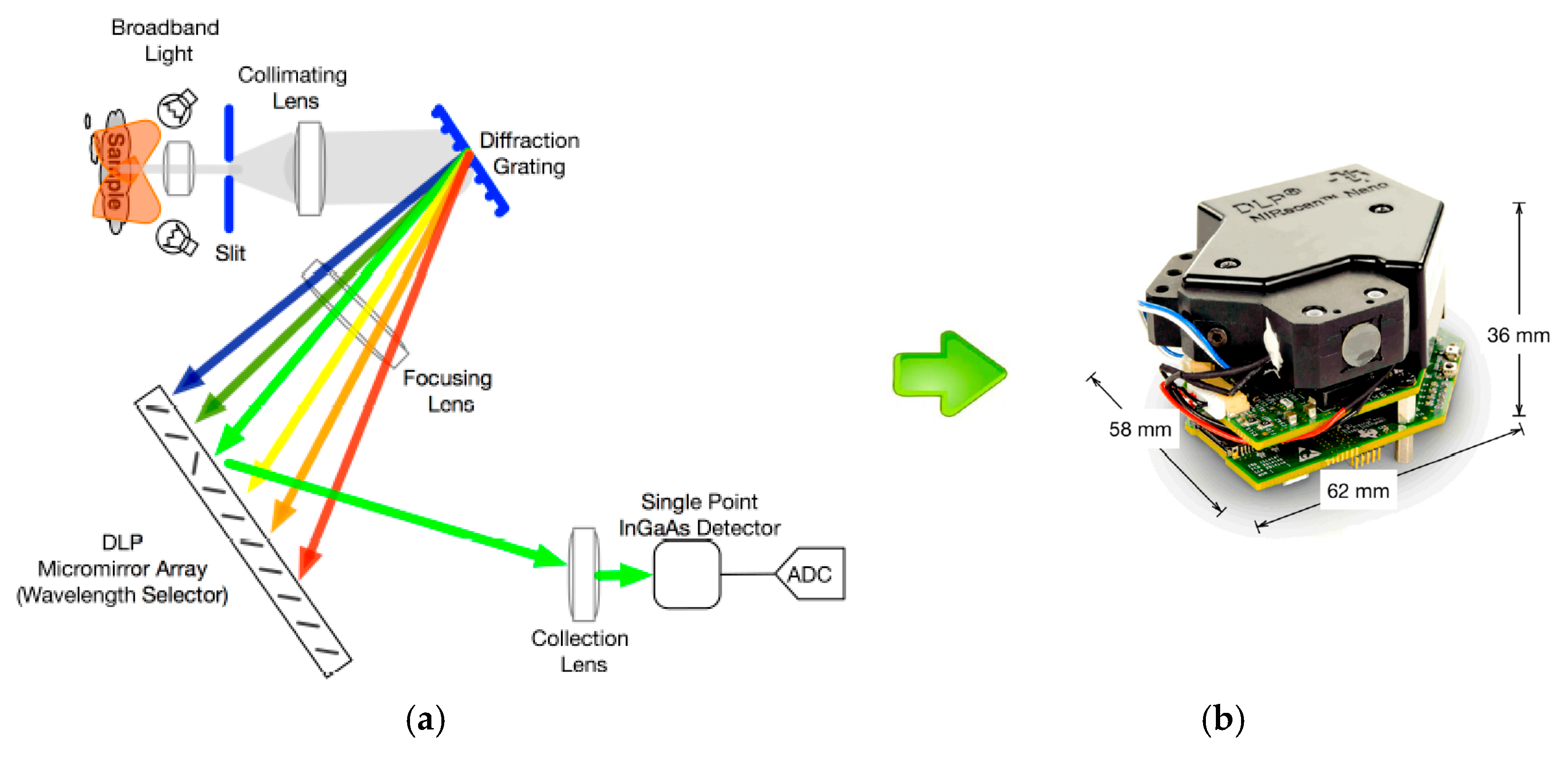 4]. This device is based on a digital micromirror device (DMD) designed by Texas Instruments, combining a light detector and a grating. It uses digital light processing (DLP) technology according to the principle of a monochromator.